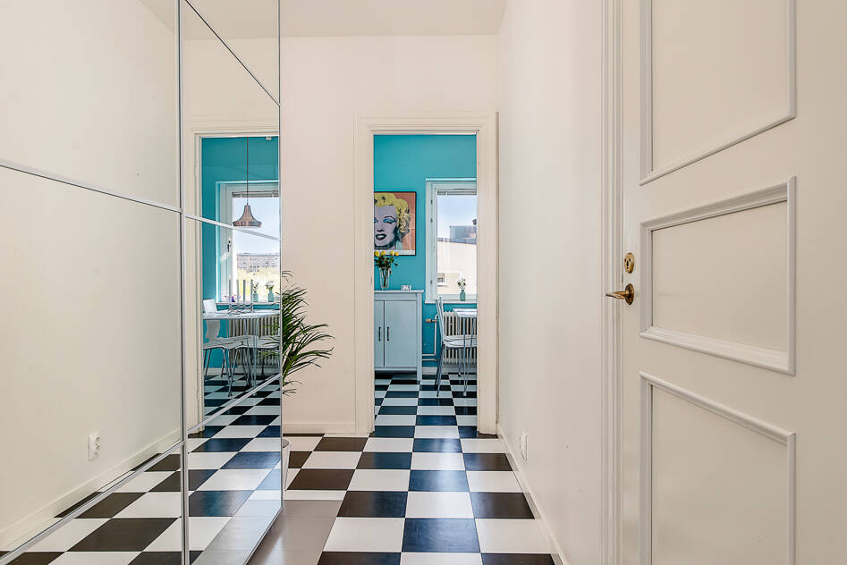 Garderober med skjutdörrar längst med hela långväggen ger en både praktisk och välkomnade entré. Golvet i hallen är svart-och vitrutigt men enfärgat under förvaringsdelen.