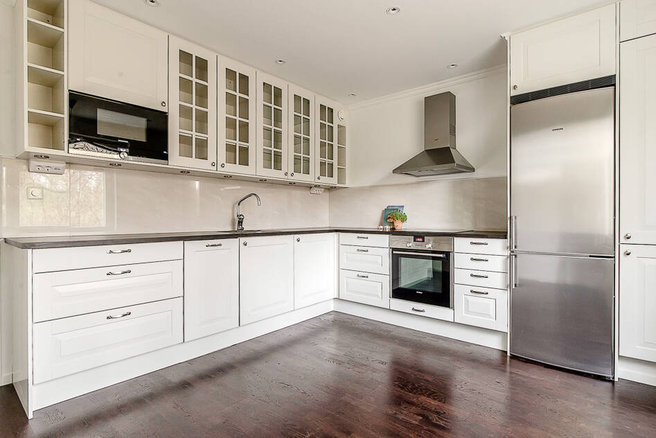 Går man till höger från hallen möts man av ett stort och vackert kök med matplats för 6-8 personer intill köksfönstret. Utsikten är mot grönska och inte ett hus i sikte. Köket är ett Marbodalskök med vita underskåp och överskåpen är vita vitrinskåp med belysning både i och under skåpen. Ovanför arbetsbänken sitter stora nya kakelplattor vilket ger ett enhetligt och ljust intryck. Även köket har fått dimningsbara LED-spotlights inbyggda i det nya taket och vägarna är målade i vitt. På golvet ligger en mörklaserad ekparkett. Samtliga tak- och golvlister är bytta och det finns en ny inbyggd mikrovågsugn. Övriga maskiner i köket är en inbyggd diskmaskin, induktionshäll med fläktkåpa ovanför, inbyggd ugn samt kyl/frys. Samtliga vitvaror är från Siemens, förutom diskmaskinen som är från Electrolux, och allt är i rostfritt.