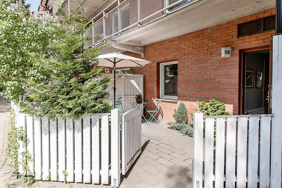 Till lägenheten hör två fina uteplatser, en med förmiddagssol och en med eftermiddags/kvällssol. Båda med fina perenner och buskar.