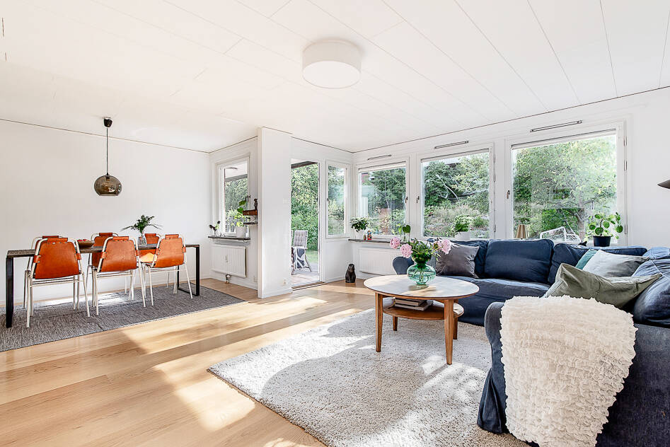 Vardagsrummet med fantastiska fönsterpartier och utgång till altanen