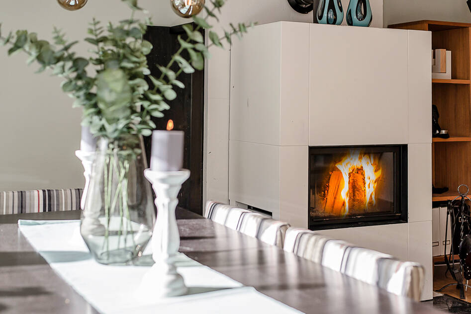 Vardagsrum, här vill man vara och umgås till en middag vid det stora matbordet eller i soffan till en bra film. Vacker originalparkett på golv och ljusa väggar. Stora fönsterpartier för härligt ljusinsläpp och rummet bländar soliga dagar. Kalla dagar värmer den öppna spisen med inbyggd kamin och ett bad i bubbelpoolen ute på den väl tilltagna altanen kan också hålla dig varm. Altanen ligger insynsskyddat och har fint syd/sydvästläge för mysiga grillkvällar.
