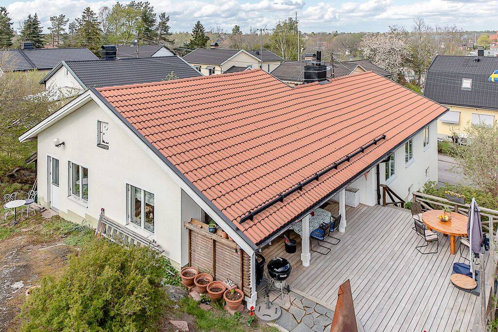 Vilken generöst stor och härlig altan ni hittar här! Altanen är belägen i högt läge med sol stor del av dagen. Man kan delvis sitta i skuggan under tak eller njuta av solen i det fria. Den trevliga arbetsbänken med bra yta för utekök och grillning, dessutom under tak gör att man kan nyttja den stora delar av året.