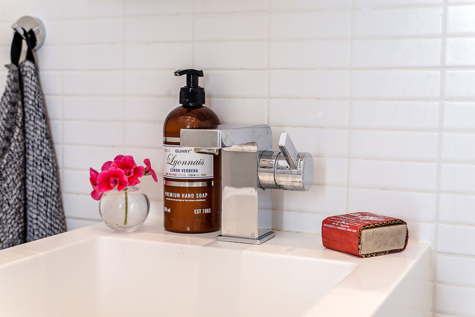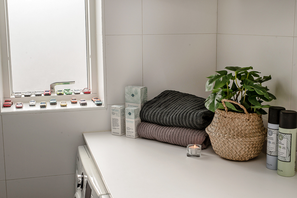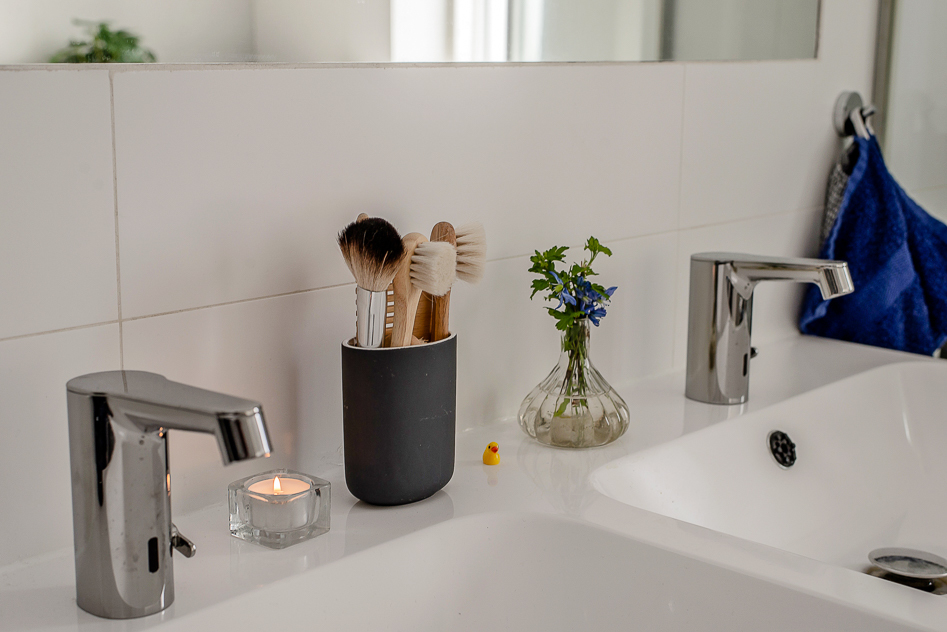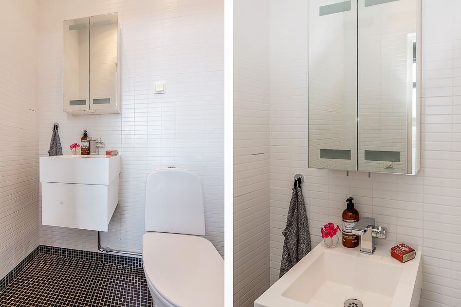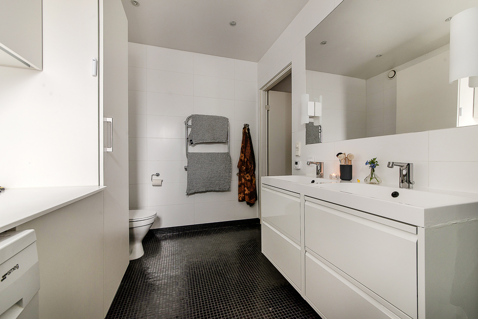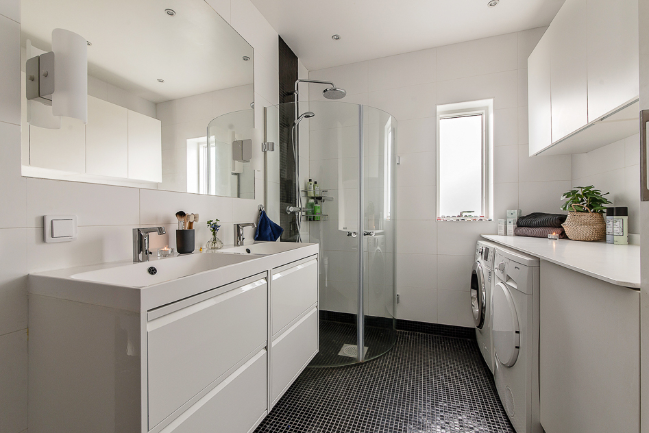 Från hallen når man det stilrena badrummet. På golvet ligger en svart glasmosaik med vattenburen golvvärme och väggarna är kaklade med stora vita liggande kakelplattor. Badrummet har en bänk i Corian. På den vänstra långsidan sitter två handfat med kommoder ( 2024) och på badrummets bortre långvägg följer arbetsbänken i Corian. Under denna bänk finns tvättmaskin, torktumlare samt ett underskåp och ovanför arbetsbänken sitter vita överskåp. Bänken avslutas mot ett vitt högskåp. Bredvid högskåpet finns toaletten och på kortsidan sitter handdukstorken. I den bortre vänstra hörnan följer den svarta glasmosaiken upp bakom duschblandaren och duschhörnan ramas in av vikbara väggar. I taket sitter inbyggda spotlights och på badrummets bortre kortsida finns ett frostat fönster.