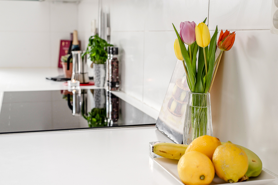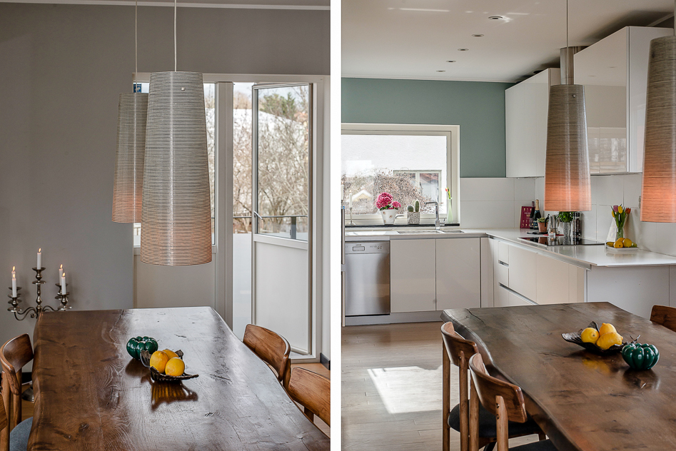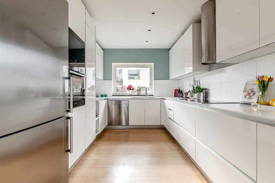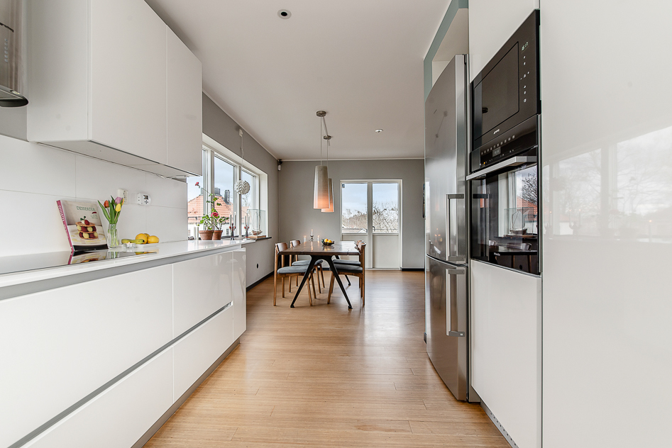Köket är ett designat kök från Meson och har generösa arbetsytor med släta vita luckor och arbetsbänkarna är i vit Corian med infällda diskhoar. Kaklet ovanför arbetsbänkarna är stora vita kakelplattor. Köket är utrustat med induktionshäll (5 plattor) med designad fläkt ovanför, inbyggd varmluftsugn, inbyggd mikrovågsugn, kyl/frys samt diskmaskin, allt i rostfritt.
