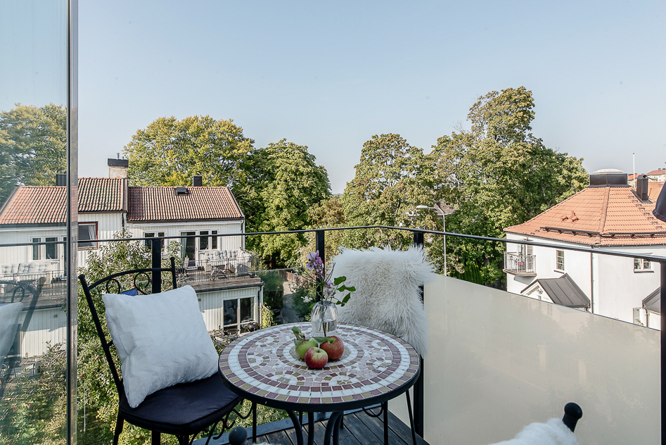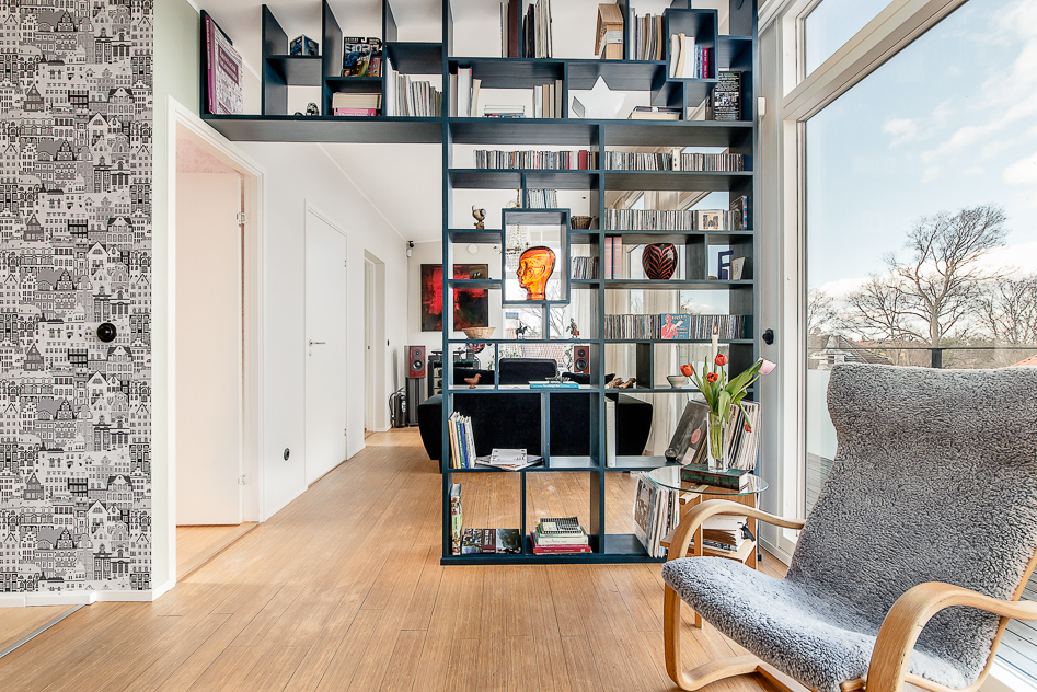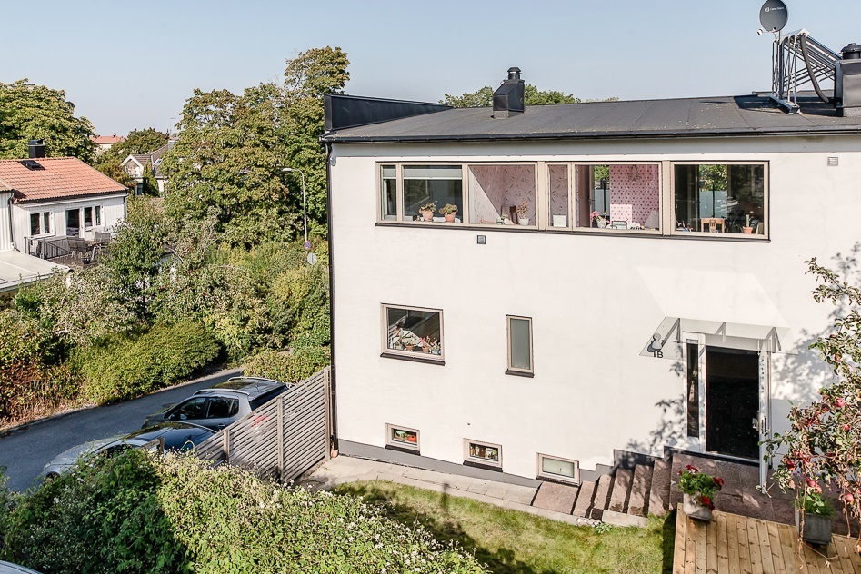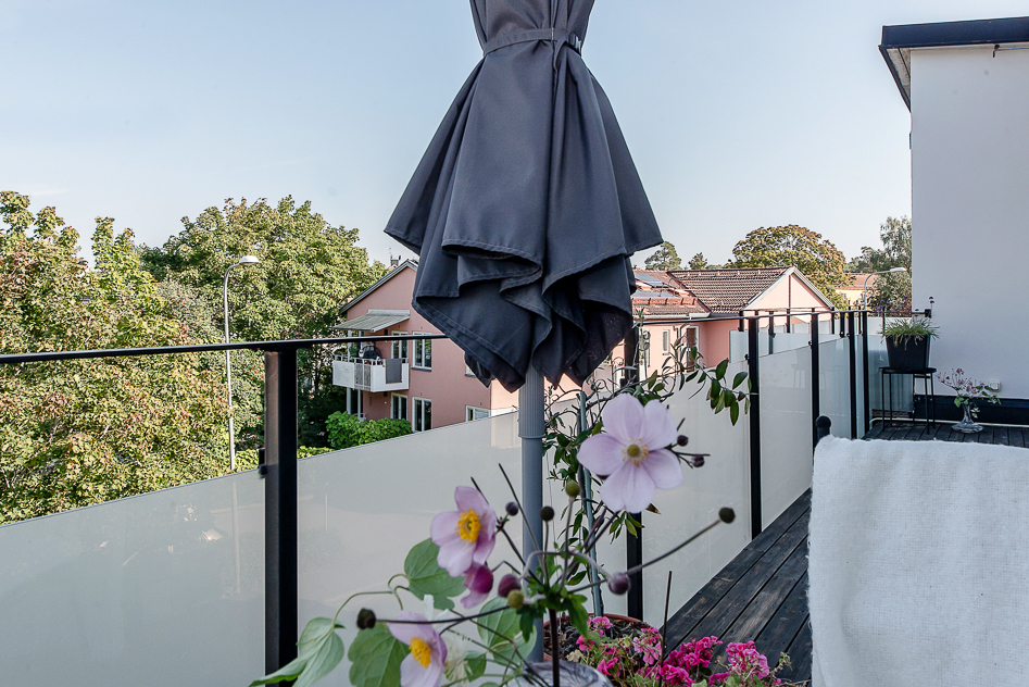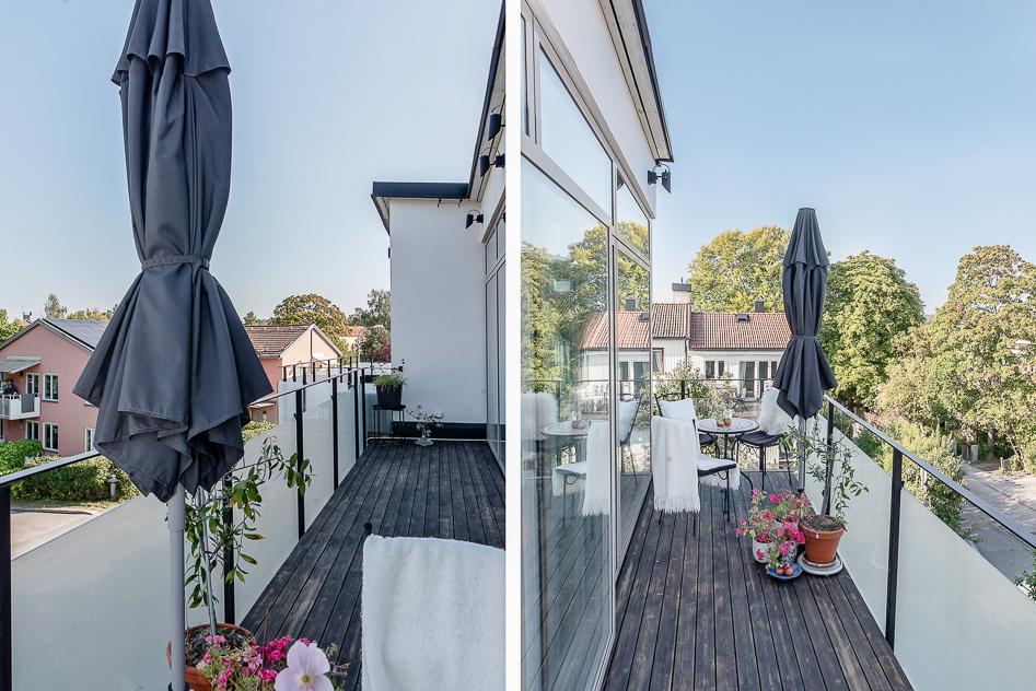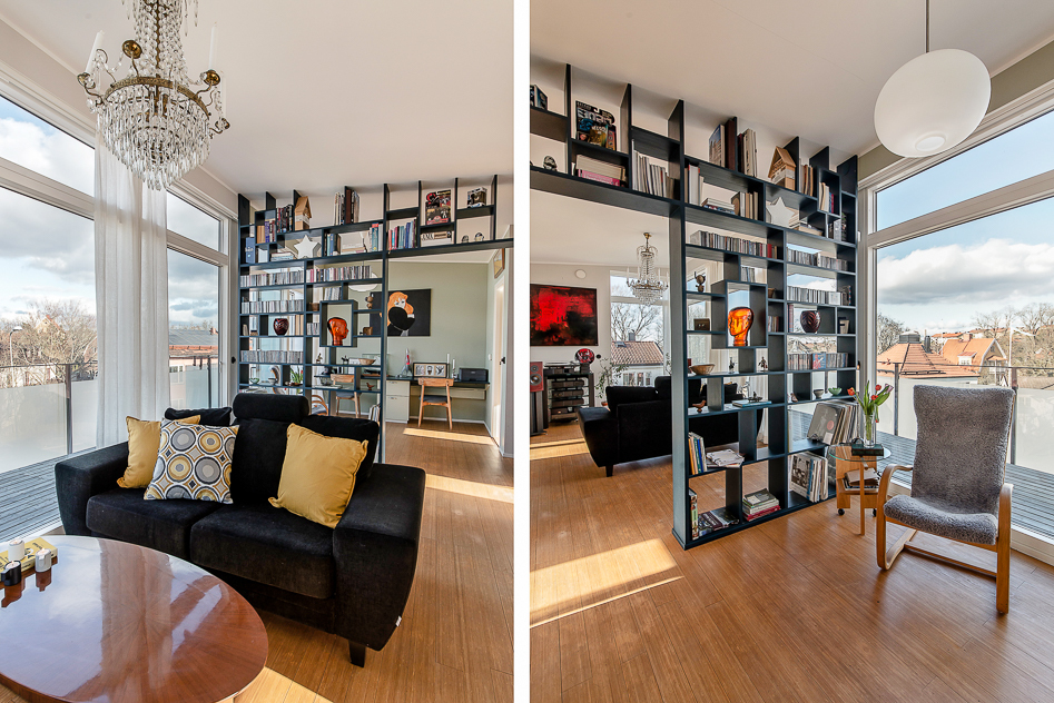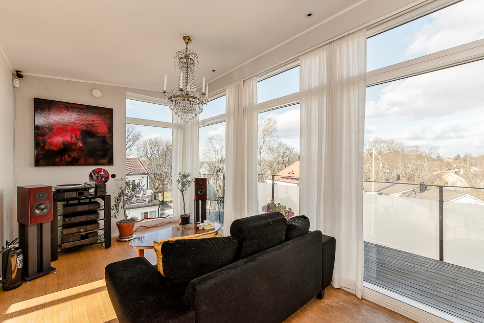 Det övre vardagsrummet har stora glaspartier som följer längs med hela rummets långsida mot den stora balkongen. Fönsterpartierna går att öppna ut till den 13 kvm stora balkongen med balkongräcke i frostat glas vilket gör att inne möter ute på ett fantastiskt sätt. Det höga fria läget gör att rummet saknar insyn och från balkongen ser man ut över Mälarhöjdens villakvarter. Vardagsrummet har hög takhöjd och delas av med en snygg platsbyggd bokhylla. I den högra delen finns två platsbyggda arbetsplatser med lådhurts och smarta eluttag. I den vänstra delen av rummet finns även ett fönster på kortsidan. Här kan man med fördel ha soffa och Tv.