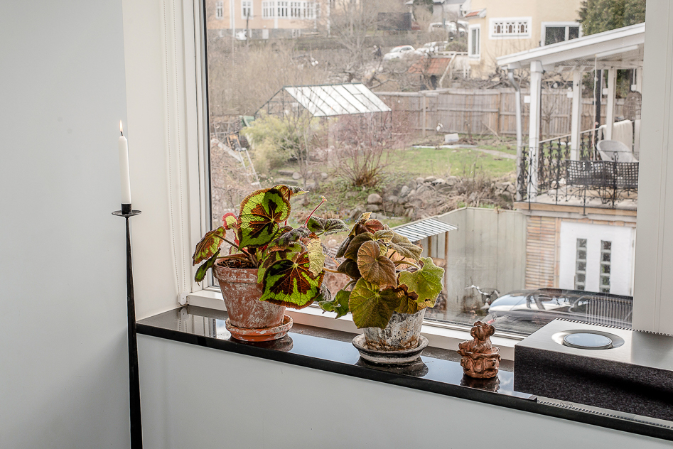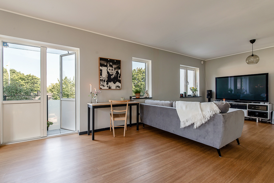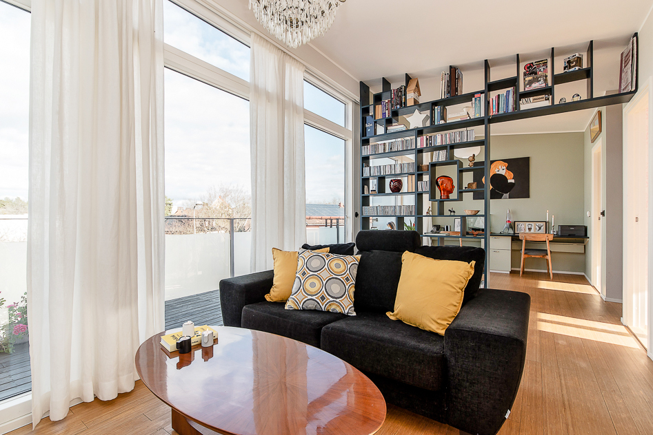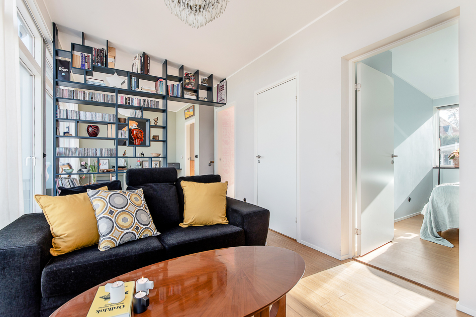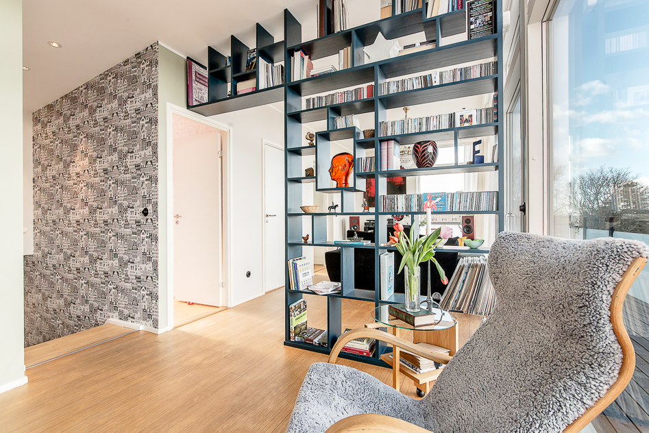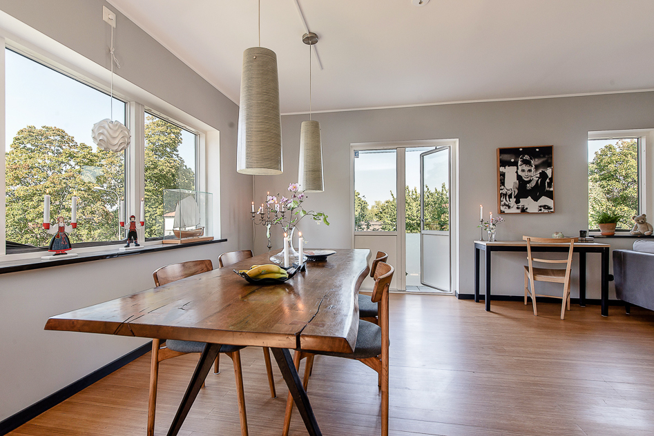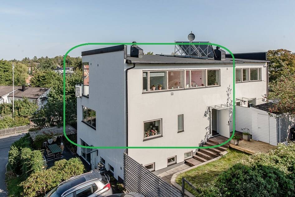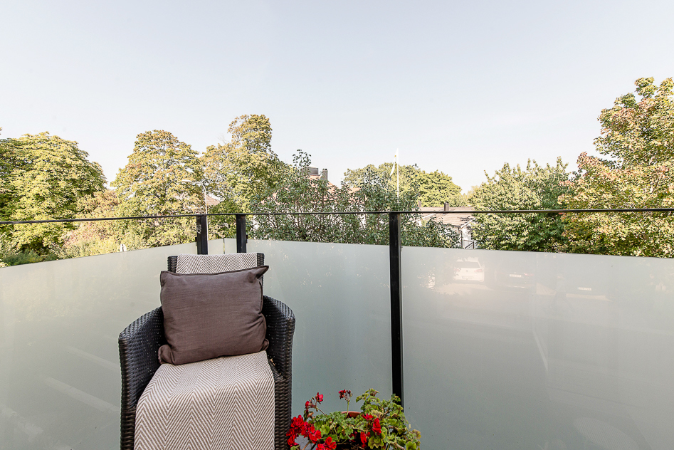 Det övre vardagsrummet har stora glaspartier som följer längs med hela rummets långsida mot den stora balkongen. Fönsterpartierna går att öppna ut till den 13 kvm stora balkongen med balkongräcke i frostat glas vilket gör att inne möter ute på ett fantastiskt sätt. Det höga fria läget gör att rummet saknar insyn och från balkongen ser man ut över Mälarhöjdens villakvarter. Vardagsrummet har hög takhöjd och delas av med en snygg platsbyggd bokhylla. I den högra delen finns två platsbyggda arbetsplatser med lådhurts och smarta eluttag. I den vänstra delen av rummet finns även ett fönster på kortsidan. Här kan man med fördel ha soffa och Tv.