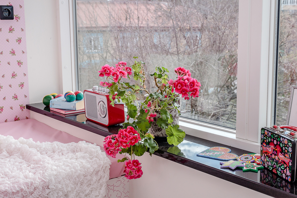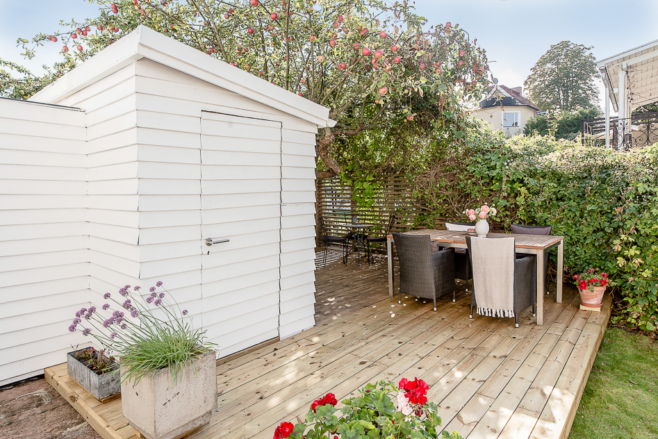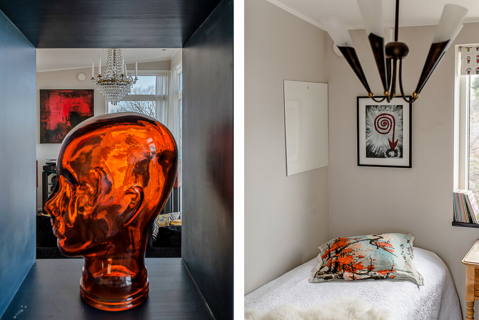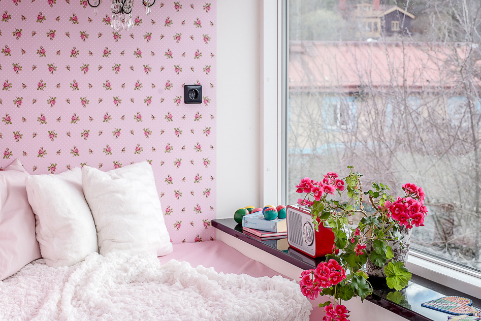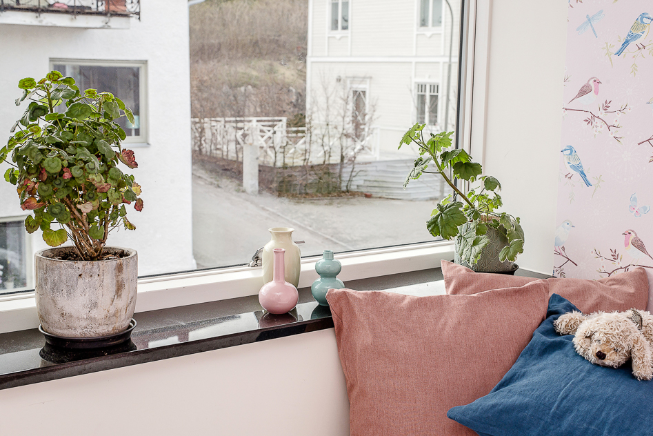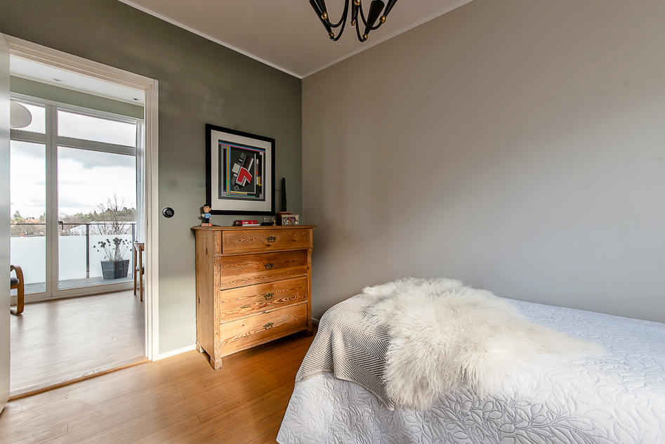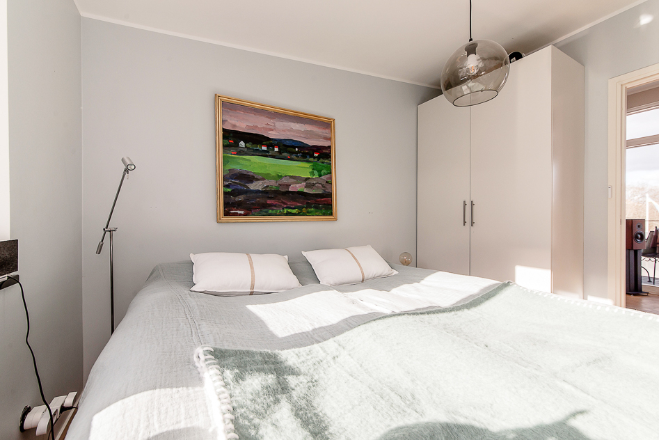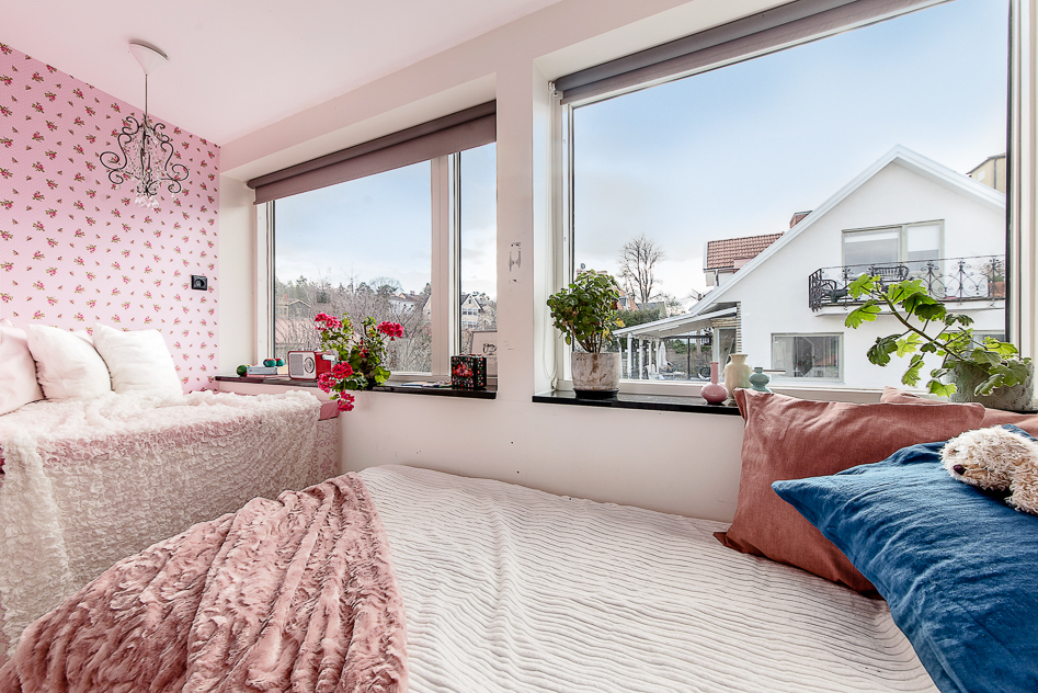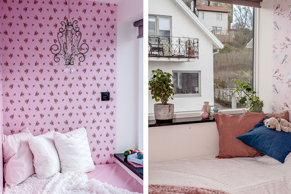 Det mittersta sovrummet är ett lite mindre sovrum med uppbyggd plats som passar perfekt som mys- eller läshörna. Rummet har tre olika tapeter som harmoniserar på ett personligt sätt. Detta sovum har ett större fönster som vetter mot lägenhetens trädgård.