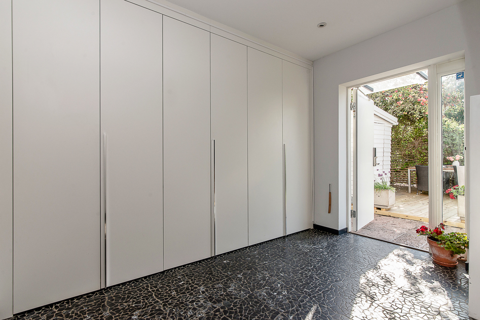Hallen är stor och längst med högra sidan löper en hel garderobsvägg med tre platsbyggda dubbelgarderober. På golvet ligger ett svart stenmosaikgolv. Väggarna är målade i en vitgrå färg och tapeten i trappan som leder upp till det övre våningsplanet är mönstrad med hussiluetter i olika grå nyanser. Under trappstegen sitter snurrbara klädkrokar och under trappan finns även plats för skohyllor. I taket sitter inbyggda spotlights.