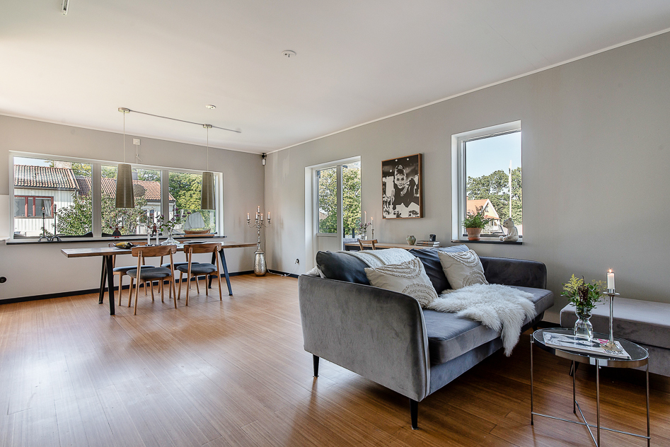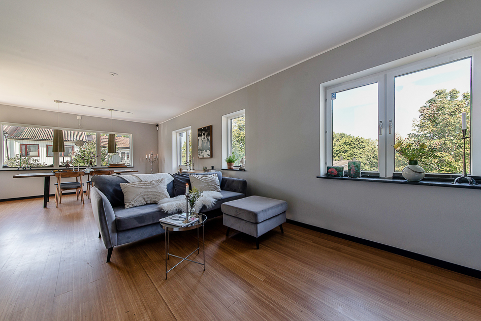 Här finns genomgående tåliga bambugolv med vattenburen golvvärme på bägge våningsplanen samt stora fönsterpartier vända mot tre väderstreck vilket ger ett härligt ljusinsläpp till bostaden .