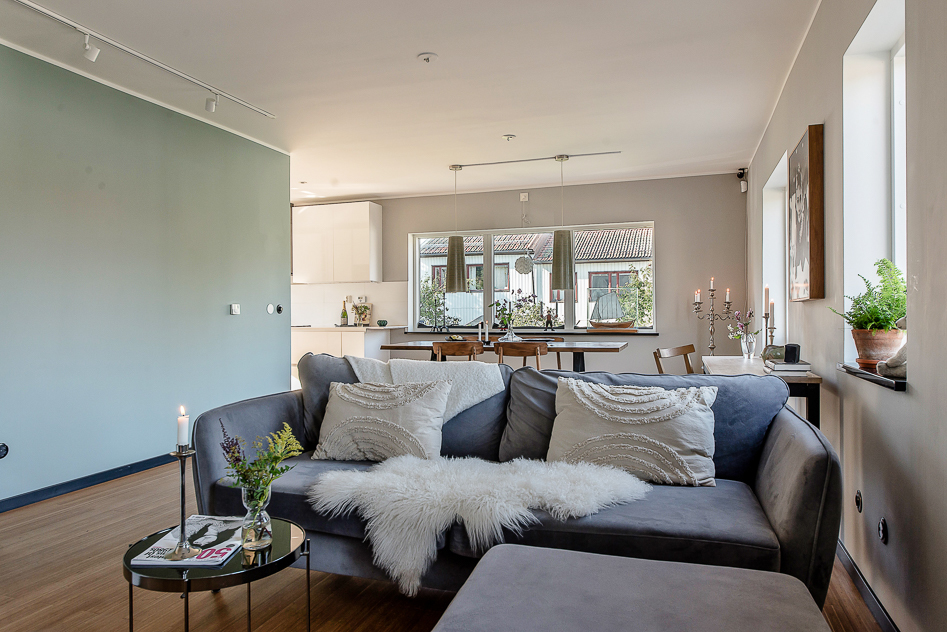 Vardagsrum och kök ligger i vinkel med en naturlig matplats utanför köket. Väggarna är målade i en svagt grå färg förutom fondväggen som följer från hallen in i köket som är i en grönblå färg. Rummet har stora fönsterpartier vända mot tre väderstreck vilket ger ett fint ljusinsläpp och eftersom rummet har ett högt läge har man ingen insyn. På golvet ligger ett oljat bambugolv och från matsalsdelen når man lägenhetens mindre balkong. (Det sitter en vägg med skjutdörr mellan vardagsrum och hall så om man önskar ytterligare ett sovrum kan man bygga till en vägg som delar av vardagsrummet. (Denna planlösning hade tidigare ägare, se den alternativa planlösningen.)