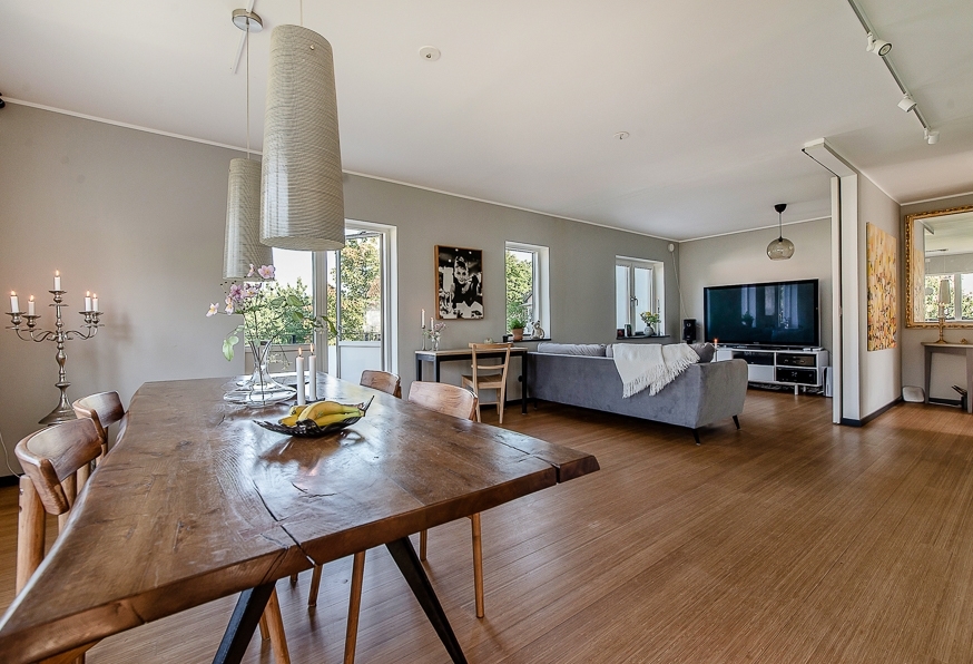 Hela lägenheten präglas av ljus, rymd, påkostade material samt fina färgval.
