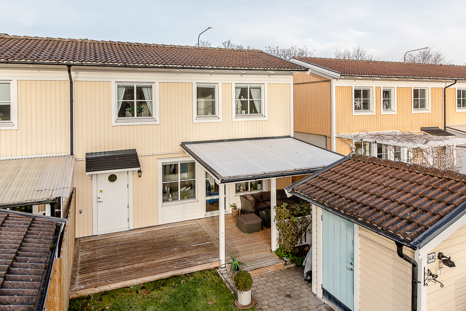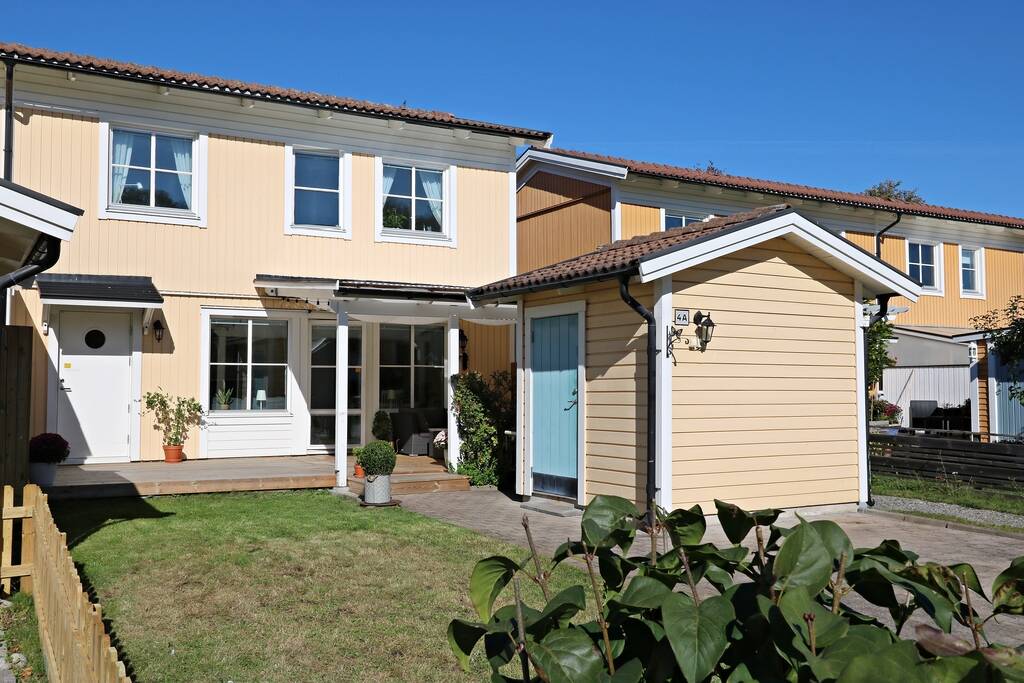 Detta bostadsrättsradhus har två trädgårdsdelar, båda med gräsmatta och framsidan har även en stor altan som följer längst husets hela framsida. Framsidan har sol från morgon till eftermiddag medan trädgården på baksidan har eftermiddags- och kvällssol. Trädgården på framsidan har en mindre gräsmatta men även en stor asfalterad parkeringsplats som rymmer minst två bilar och framför parkeringsplatsen står ett fristående förråd på ca 7 kvm. Nedanför altanen på husets baksida finns ett litet äppelträd.