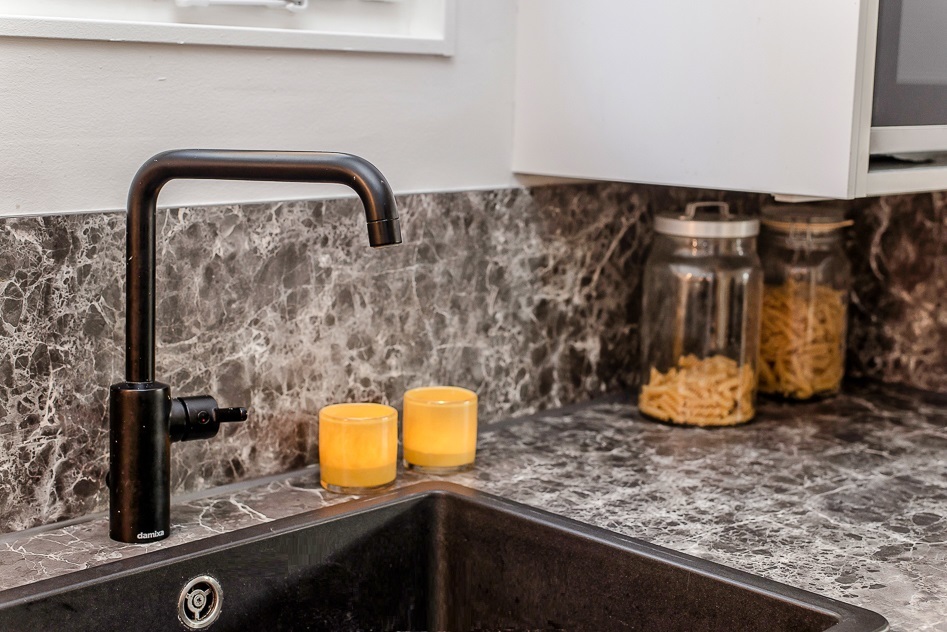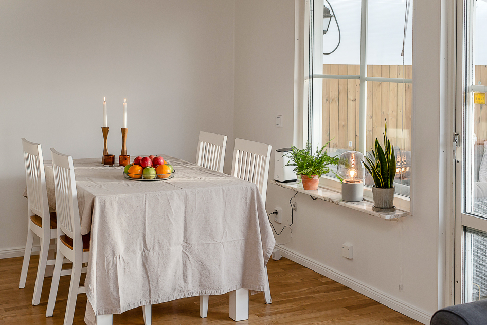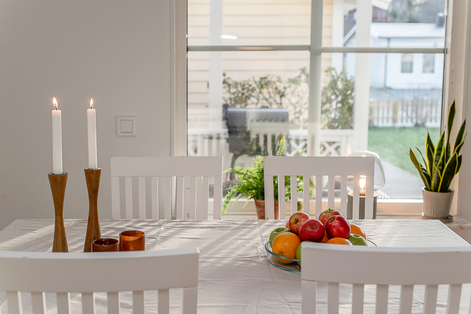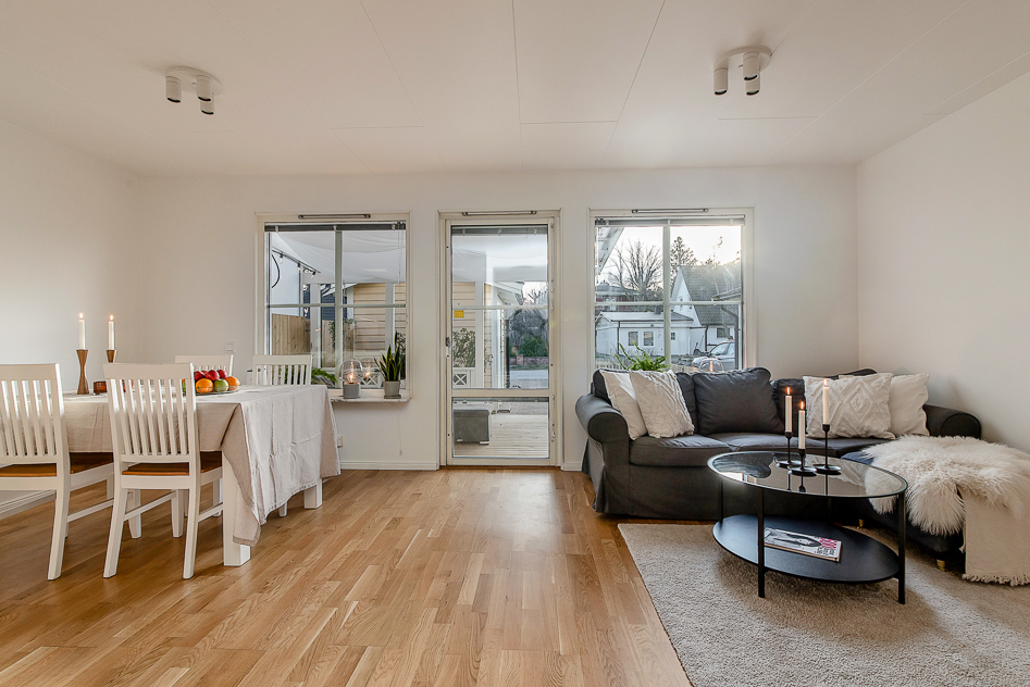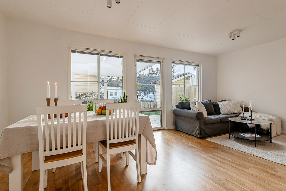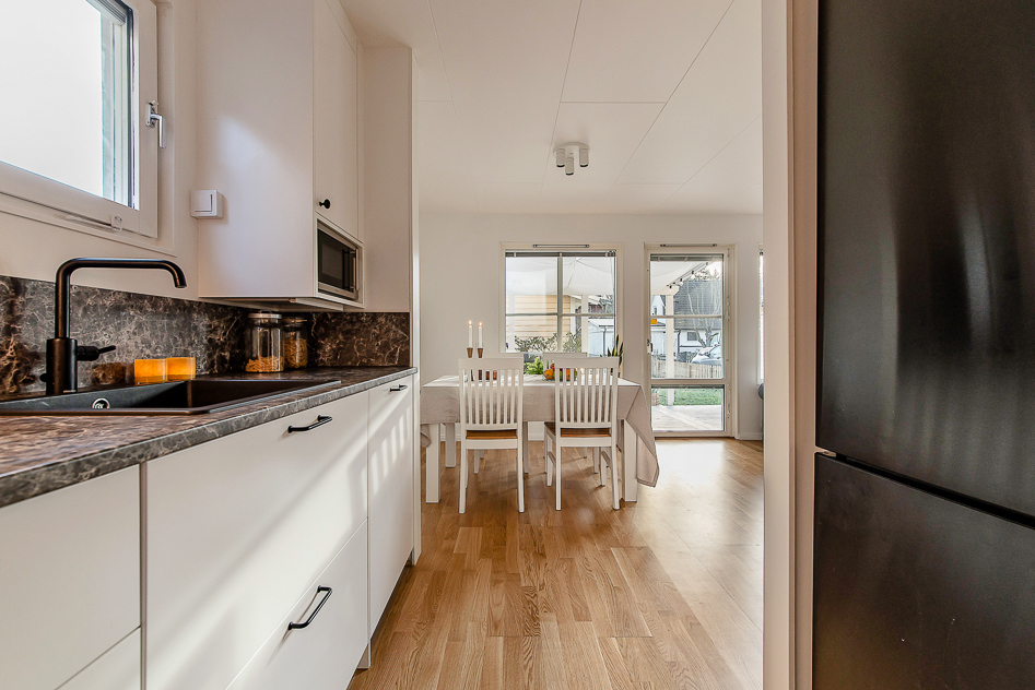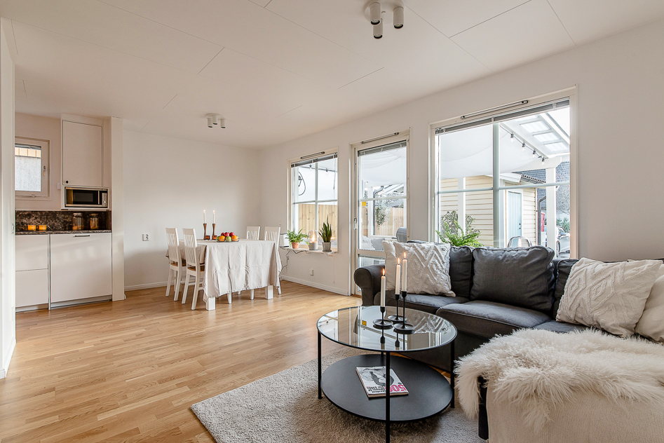 Köket går i vitt och är byggt 2023 och ligger skyddat bakom en vägg mot vardagsrummet men har en öppen planlösning mot matplatsen och den öppna planlösningen fortsätter in i vardagsrummet. Rummets långsida har stora fönsterpartier och en altandörr med glasrutor leder ut till den stora altanen på husets framsida.