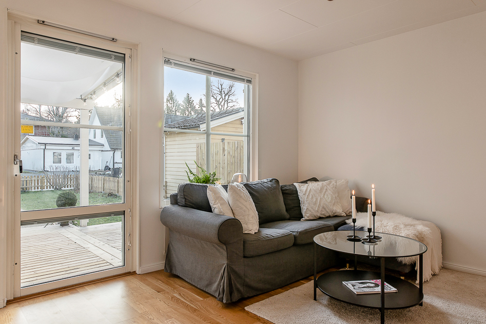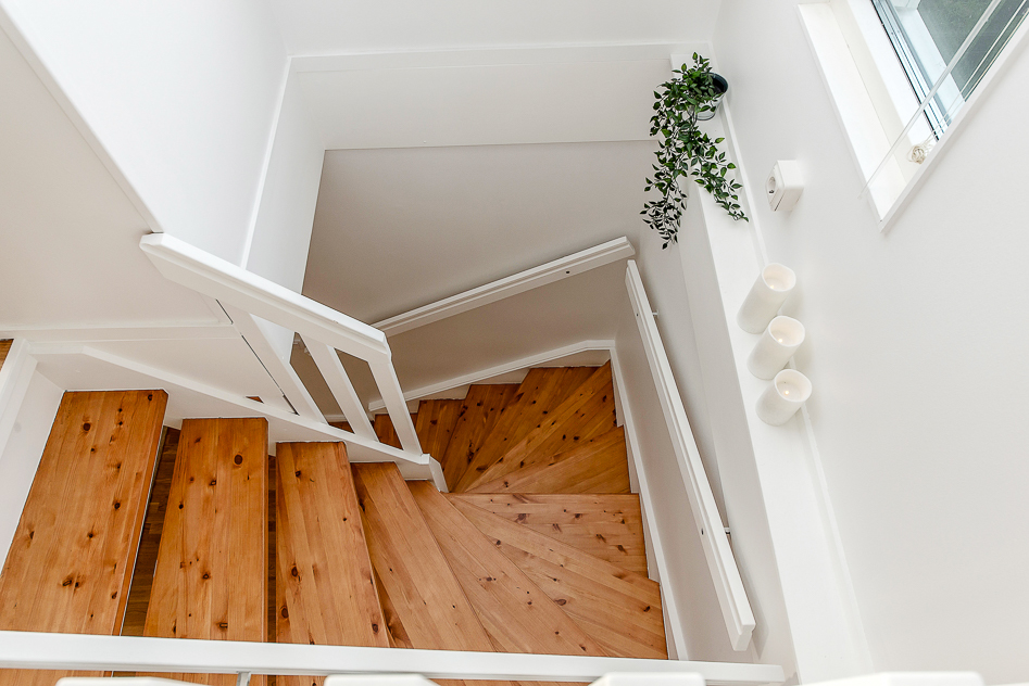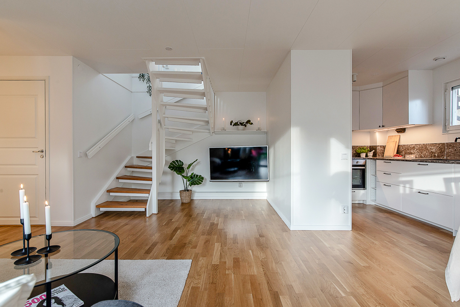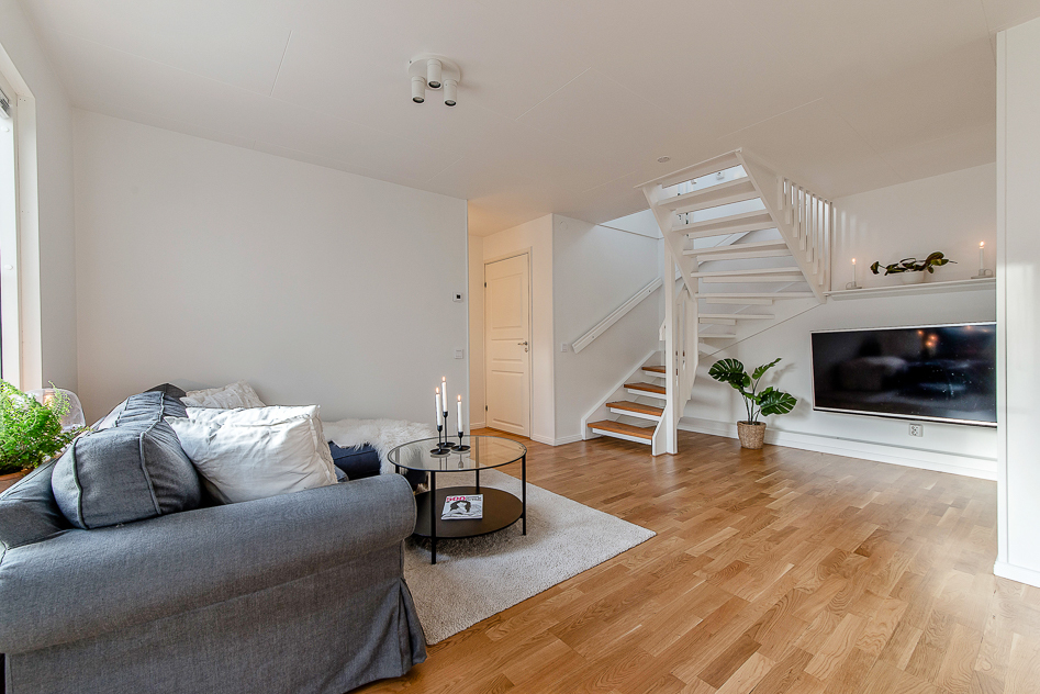 Vardagsrummet är stort och rymligt med vitmålade väggar. I vardagsrummet finns även trappan som leder upp till det övre våningsplanet. I trappan sitter en luftvärmepump.
