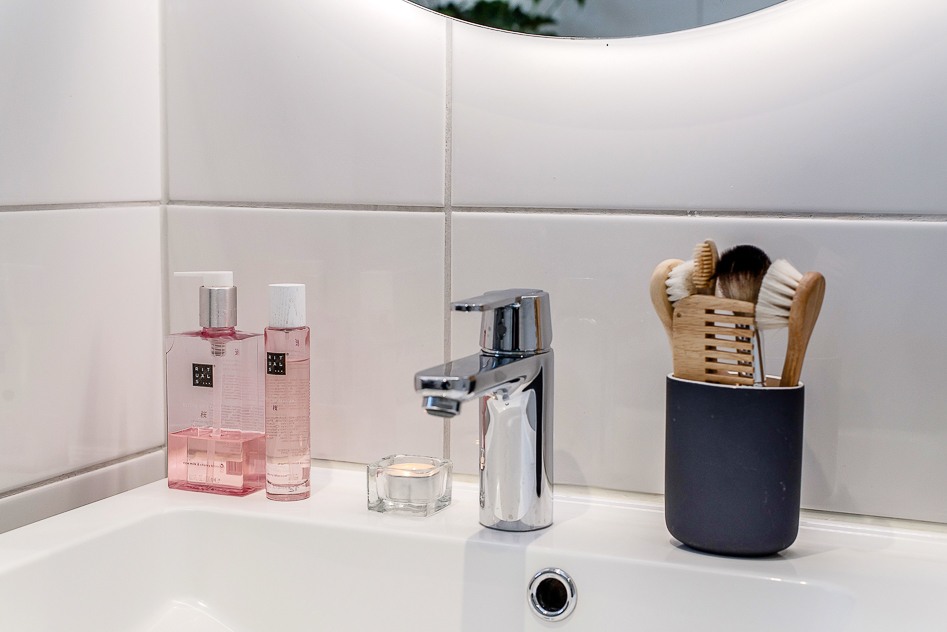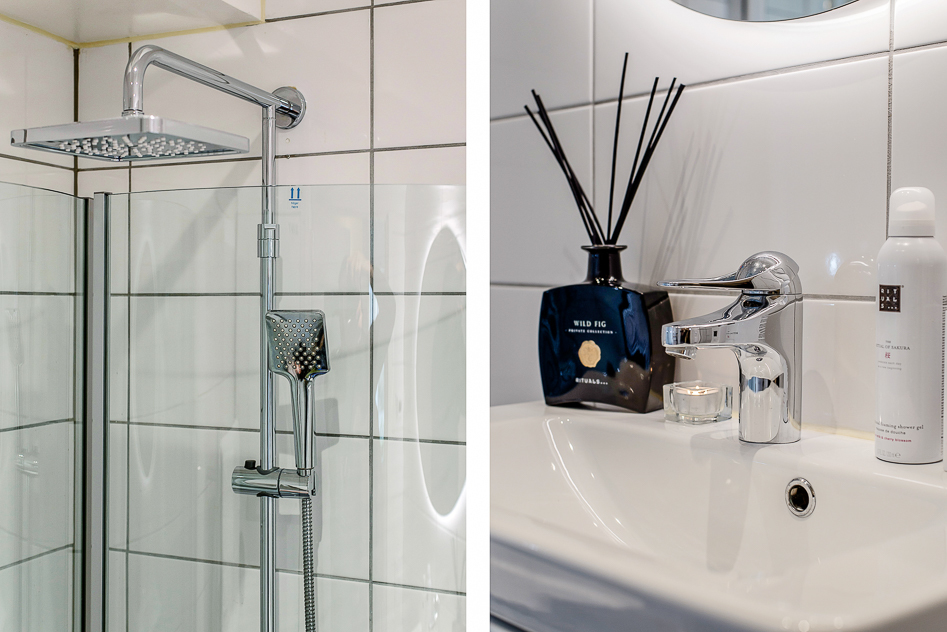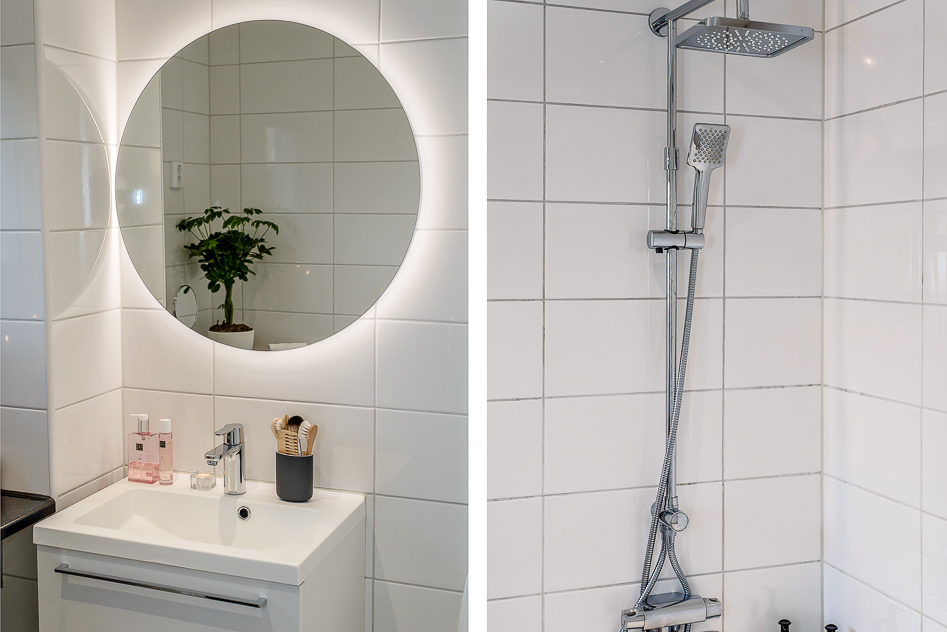 Badrummet ligger rakt fram från entrén och renoverades 2019. Här finns en duschhörna med vikbara dörrar, wc-stol, handfat med kommod. Här finns även varmvattenberedare och luftvärmeväxlare. På golvet ligger ett eluppvärmt klinkergolv och väggarna är klädda med ett vit kakel och i taket finns inbyggda spotlights. (Kvalitetsdokument finns)