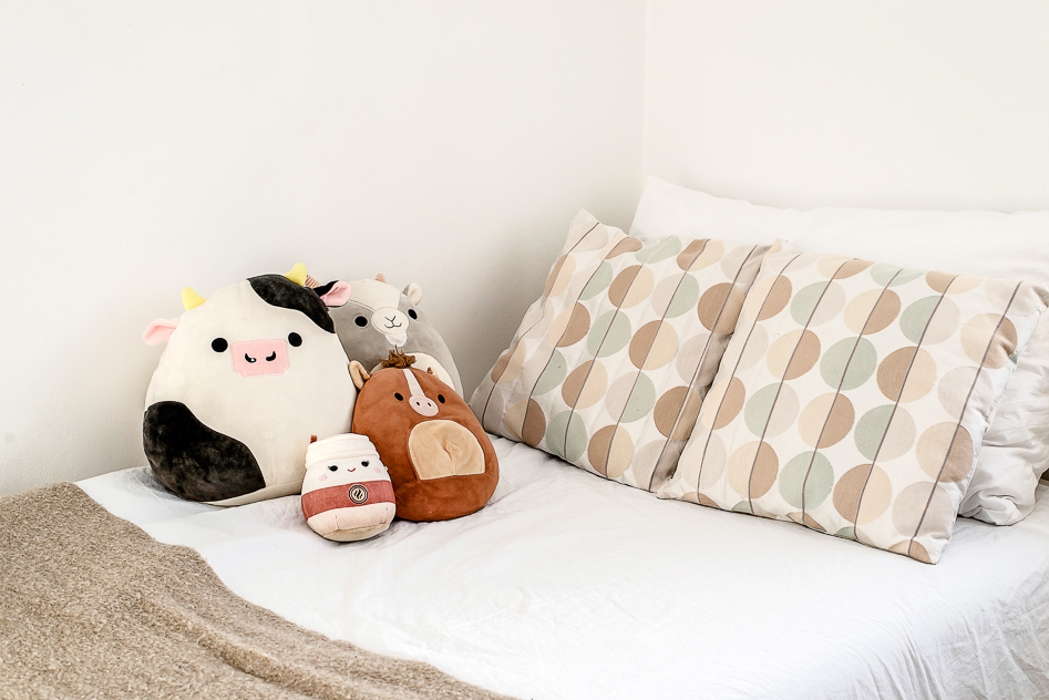 Master bedroom har en intilliggande walk-in-closet och fönstret är placerat ovanför den anlagda uteplatsen på framsidan. Väggarna är vitmålade.