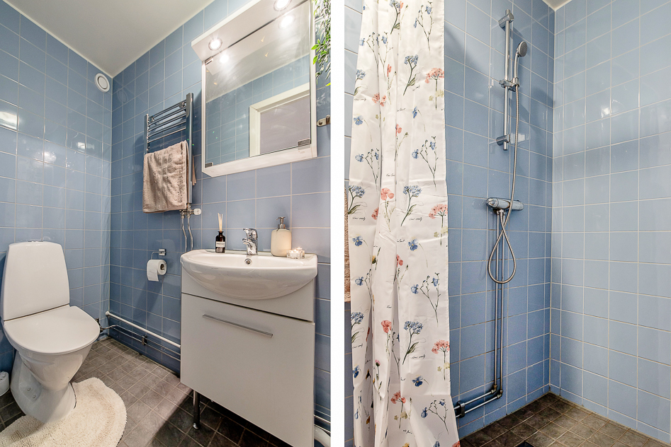 Badrummet på entréplan är helkaklat med ett ljusblått kakel och på golvet ligger ett ljust klinkergolv. badrummet är utrustat med duschhörna, toalett, handfat med kommod, handdukstork samt badrumsskåp med belysning.