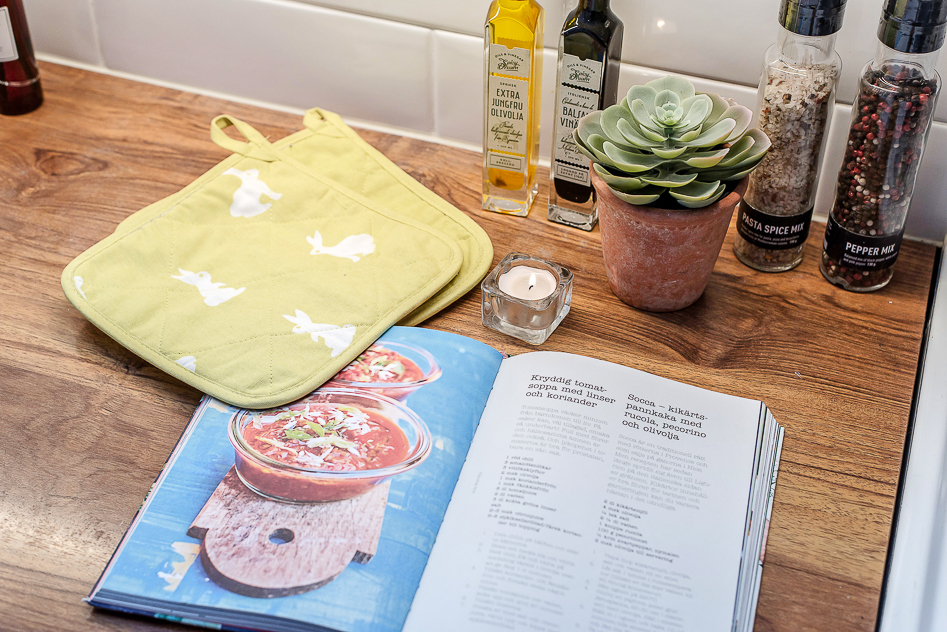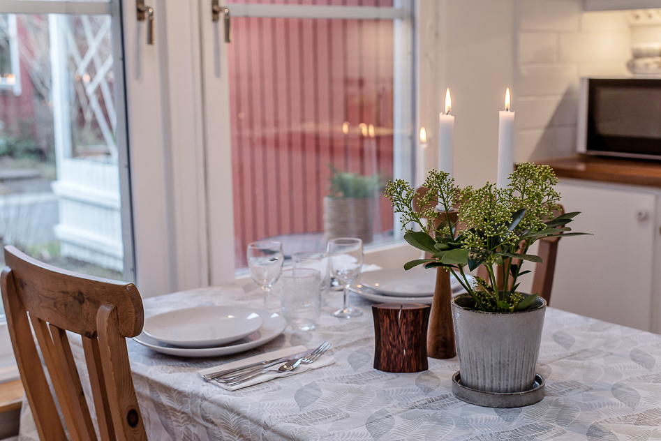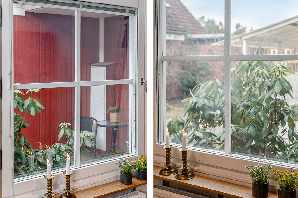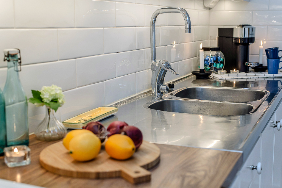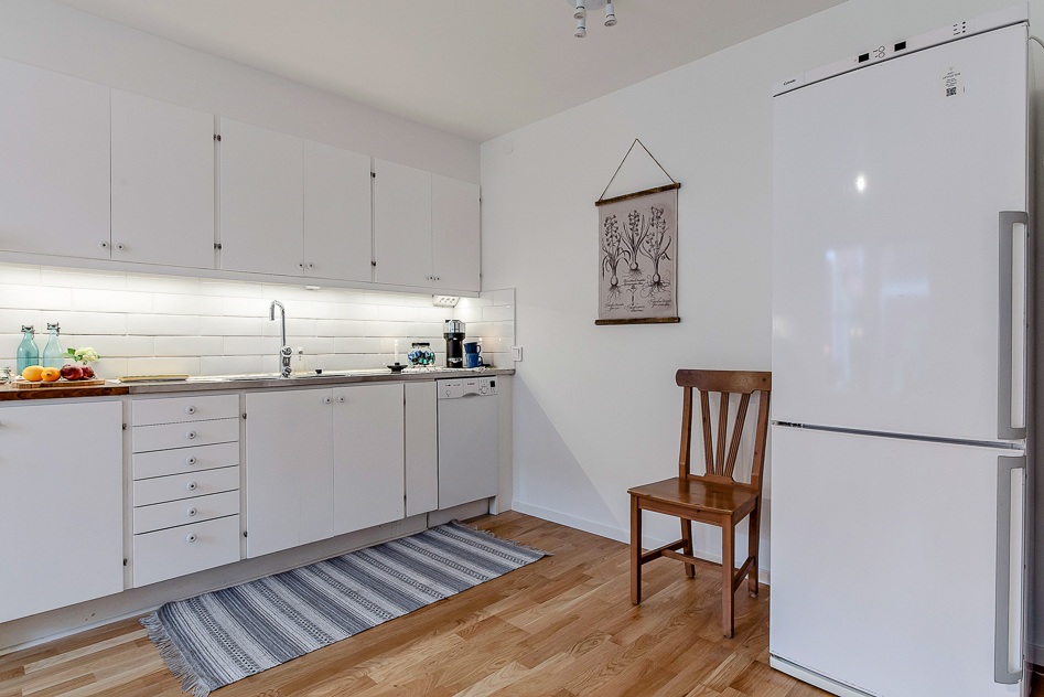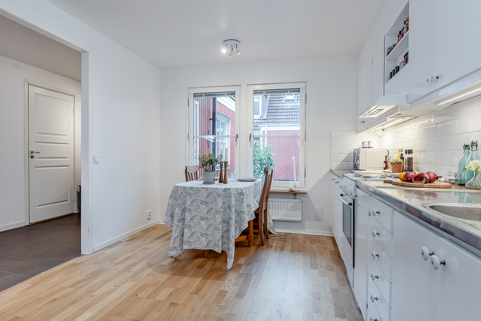 Köket ligger till vänster om entrén och även fönstret har fönster vänt mot den lilla uteplatsen. Köket har ett nytt parkettgolv samt ett nytt vitt kakel. Luckorna är renoverade och målade i vitt och taket är nytt.