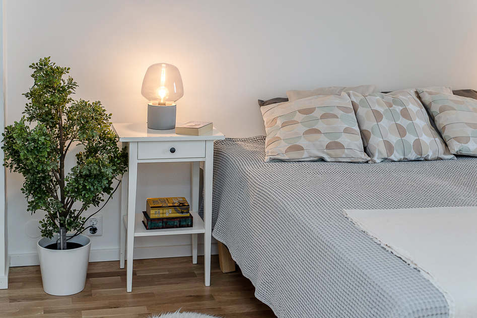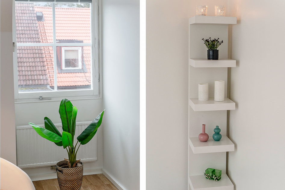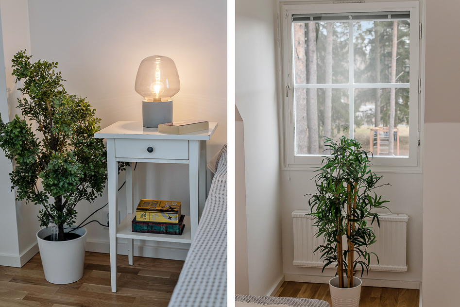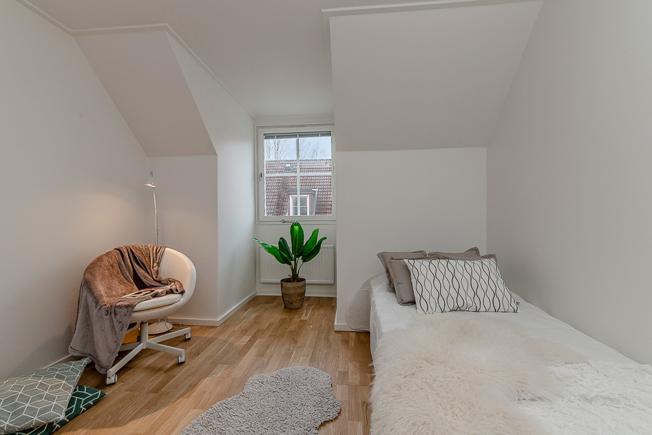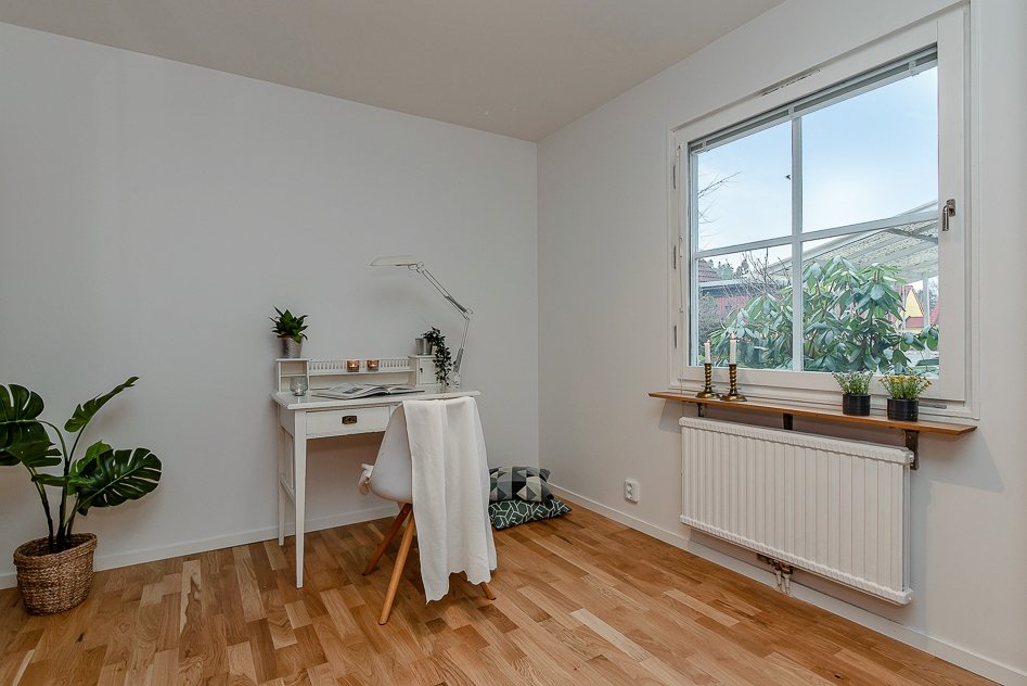 Två sovrum med fönsternicher, det ena är vänt mot entrén och det andra är vänt mot skogen. Ytterligare ett rum på detta plan men rummet har endst ett takfönster. passar perfekt som barnrum eller kontor.