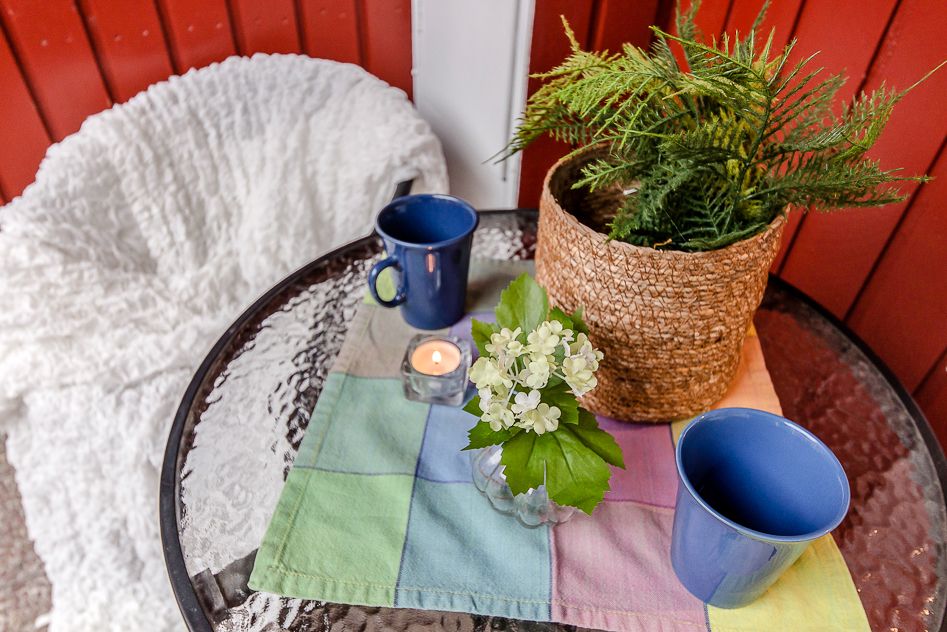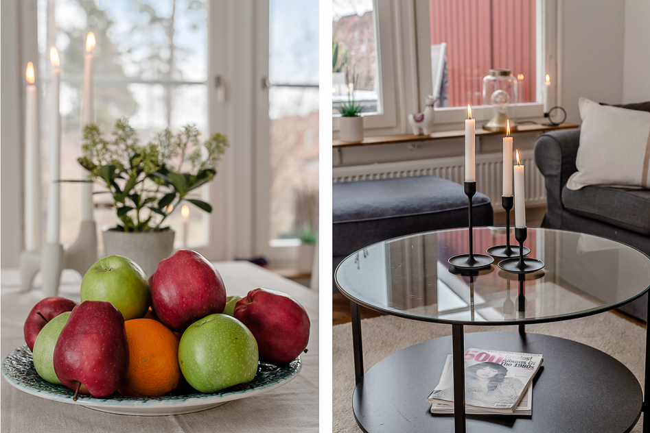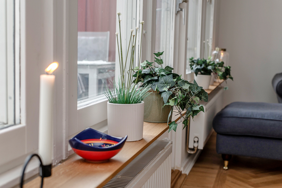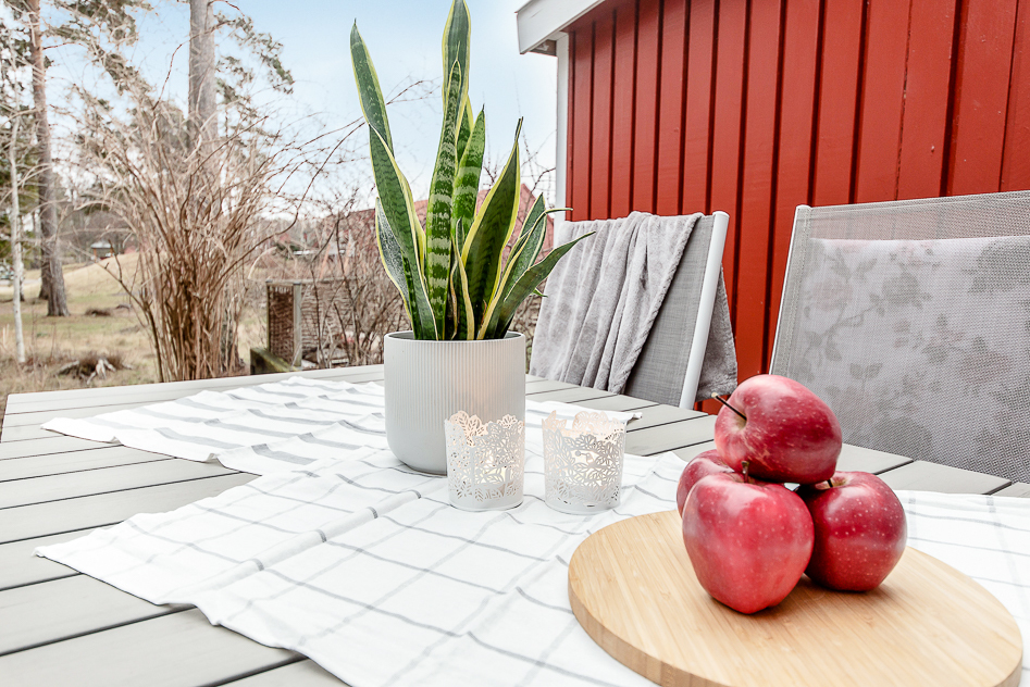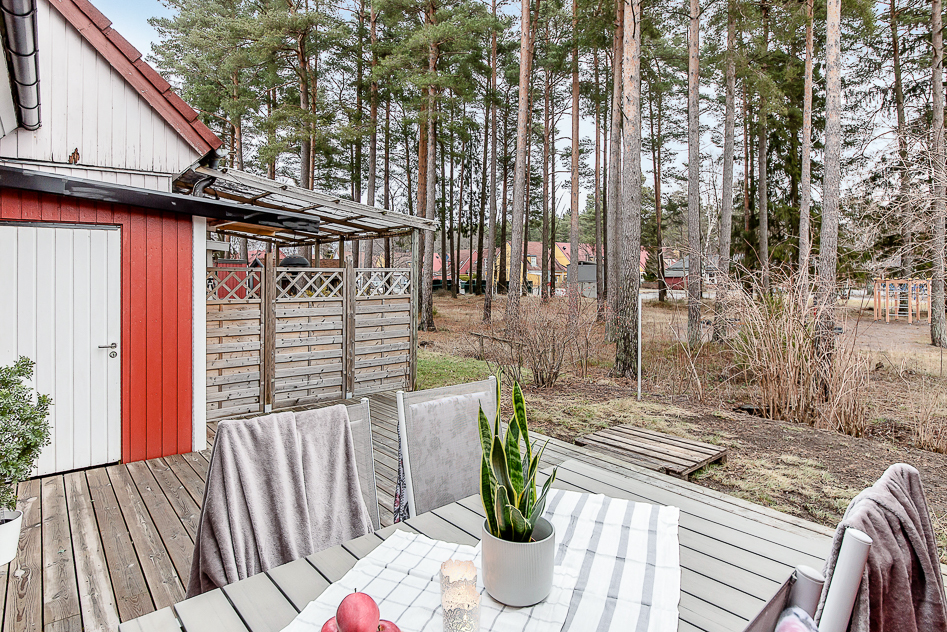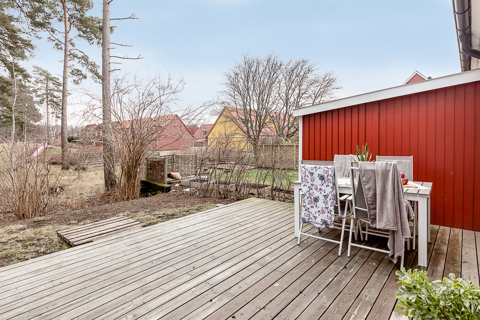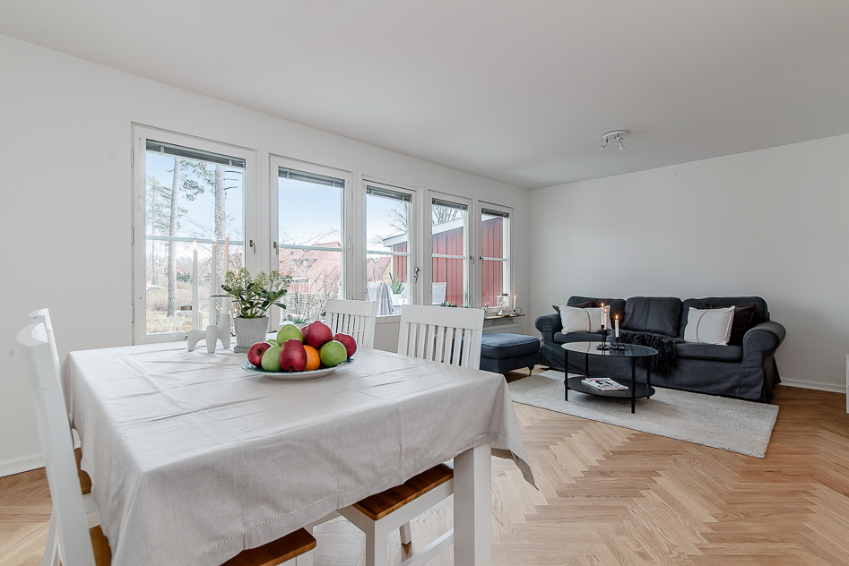 Vardagsrummet har elburen golvvärme under den vackra fiskbensparketten. Stort fönsterparti mot den stora altanen i trä. Altanen vetter mot skog och en lekplats och ramas in av ett uteförråd. Altanen anlades 2022.