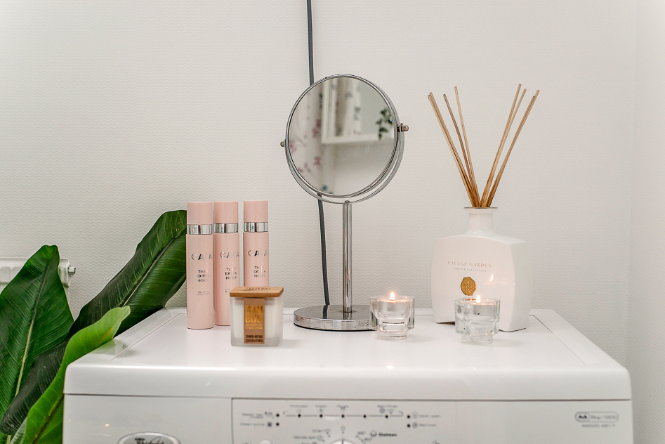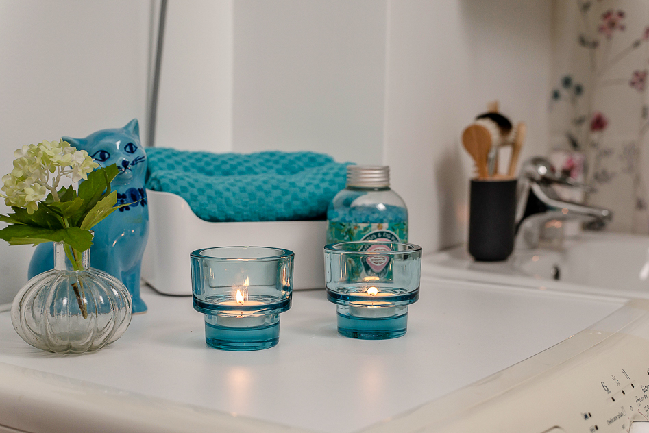 Badrummet på detta plan har badkar, handfat, handdukstork, toalett samt tvättmaskin och torktumlare. På golvet ligger en ljusgrön våtrumsmatta och väggarna är målade i vitt.