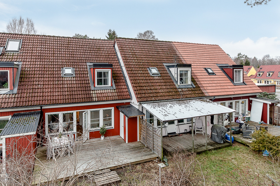 Välkomnande entré med liten uteplats framför köksfönstret. Väl inne möts man av ett totalrenoverat radhus förutom badrummen.