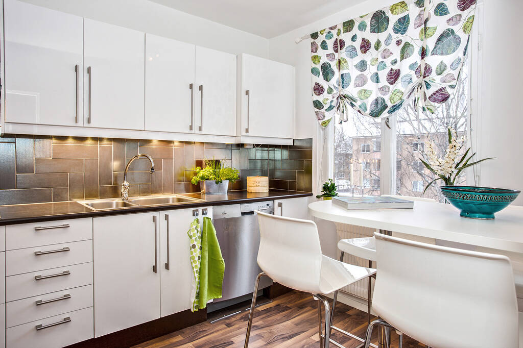 Snyggt vitt kök med fint kakel ovanför bänkskivan i massivt mörkt trä. Köket är välplanerat med lång arbetsbänk och här finns rostfria vitvaror såsom glaskeramikhäll, köksfläkt, varmluftsugn, micro, inbyggd expressomaskin, diskmaskin samt kyl/frys. Väggen mellan kök och sovrum är inte bärande och kan tas ner om man önskar ett stort kök. Vita väggar samt laminatgolv.