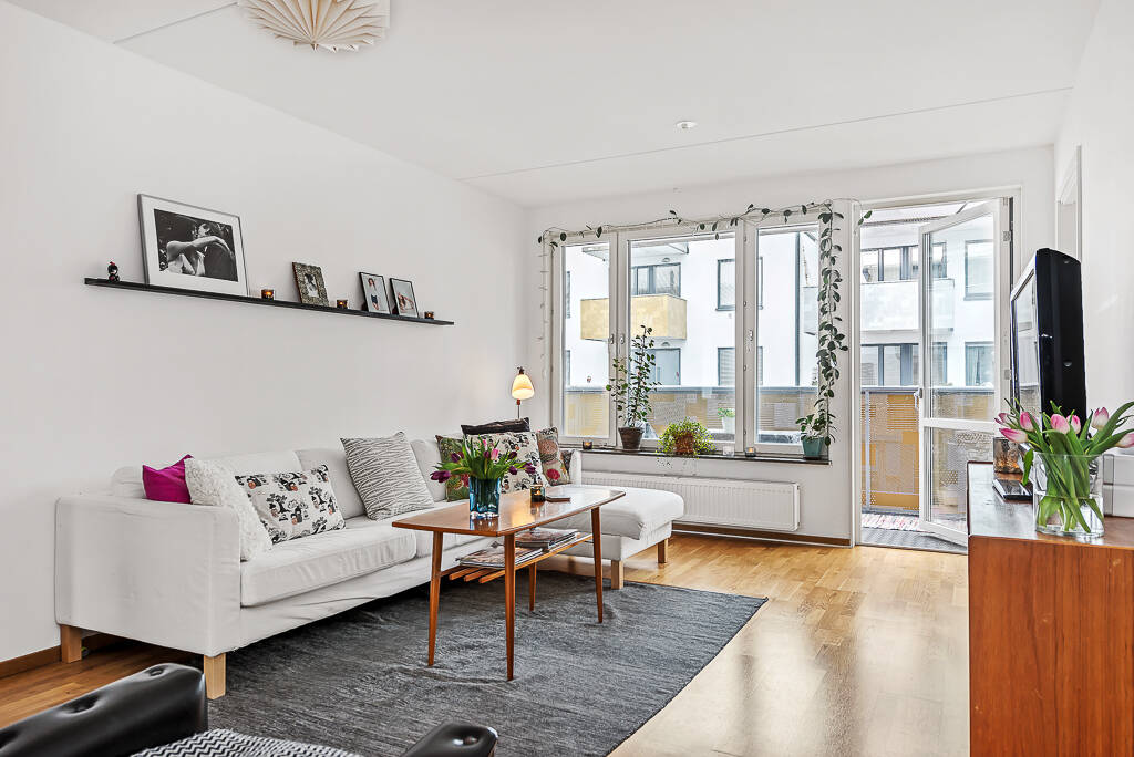 Stort vardagsrum med utgång till lägenhetens balkong. Helt fönsterparti mot balkongen ger rymd och ljus till rummet.