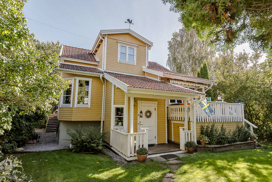 Altanen har ett högt och skyddat läge med utomhustrappa som leder ner till trädgården. Här kan man njuta av en god middag i kvällssolen. Även denna altan har praktisk förvaring som nås från en dörr vid entrén.