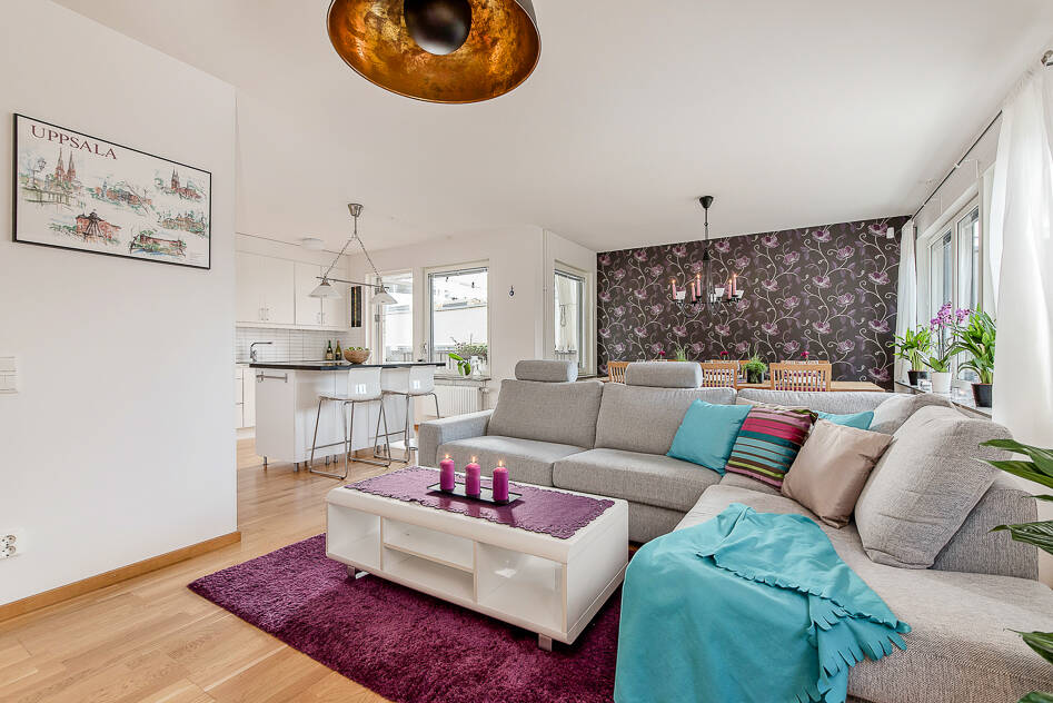 Vardagsrummet går i vinkel med köket och rymmer både matsalsmöbel och sittgrupp. Fondvägg med mycket karaktär på ena kortväggen och många fönster. Det finns både fönster mot balkongen och fönster som vetter mot allmänningen utanför. Om man vill ha ytterligare ett sovrum med fönster kan man dela av vardagsrummet och samtidigt ta bort köksön. Då får man ett bra sovrum med klädkammare samtidigt som man erhåller ett arbetsrum/gästrum utan fönster av den nuvarande klädkammaren. ( Se Alternativ planritning 1)
