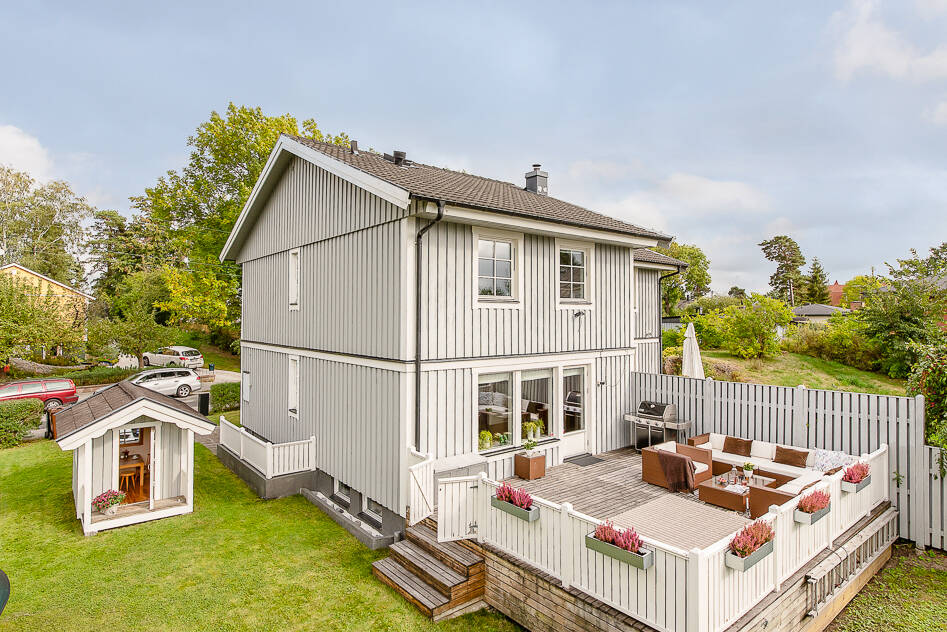 Altanen nås från vardagsrummet och är verkligen en plats att njuta på. Här finns plats för både matbord, loungedel och solstolar. Altanen ramas in av ett vitt staket med dubbelgrind. Praktiskt om man t ex har mindre barn eller hund. Altanen är helt avskärmad från grannfastigheten då fastigheterna dels ligger med en förskjutning och även har ett högt plank mellan sig.