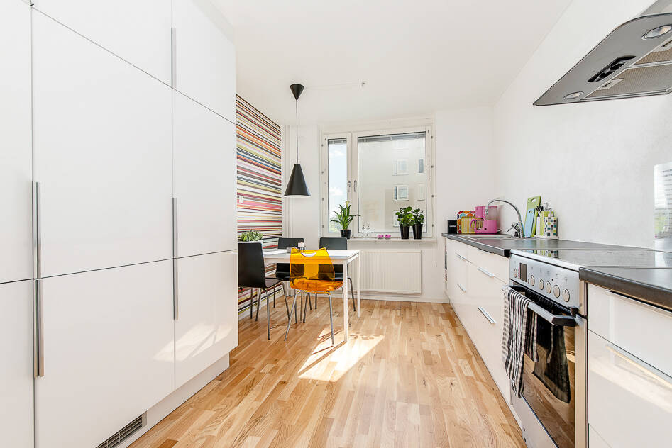 Köket byggdes om 2010 och väggen flyttades så att köket blev större och trevligare. Idag är det vita snygga högblanka köksluckor, diskbänk och svarta laminatbänkar med "ruff" vägg ovanför. I övrigt vita väggar, randig fondtapet samt parkettgolv. I köket finner ni dubbel kyl/frys som är integrerade, integrerad diskmaskin, rostfri ugn, häll, microugn och fläkt. Ett kök att trivas i!