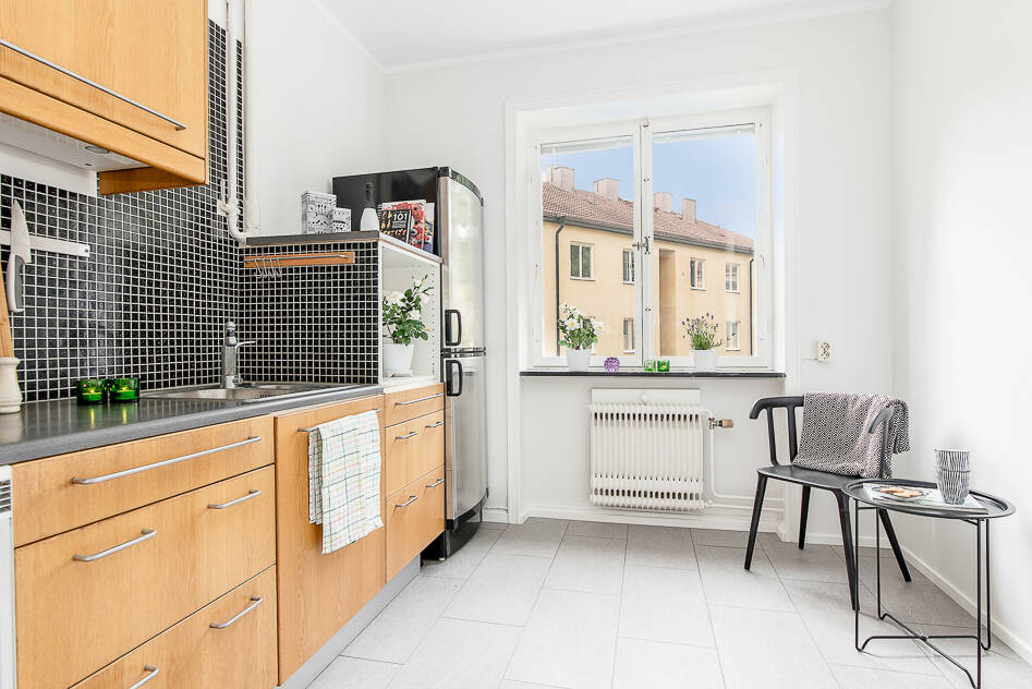 Ljust och trevligt kök med fönster in mot innergården. Här får ett matbord plats som rymmer ca 4 personer.