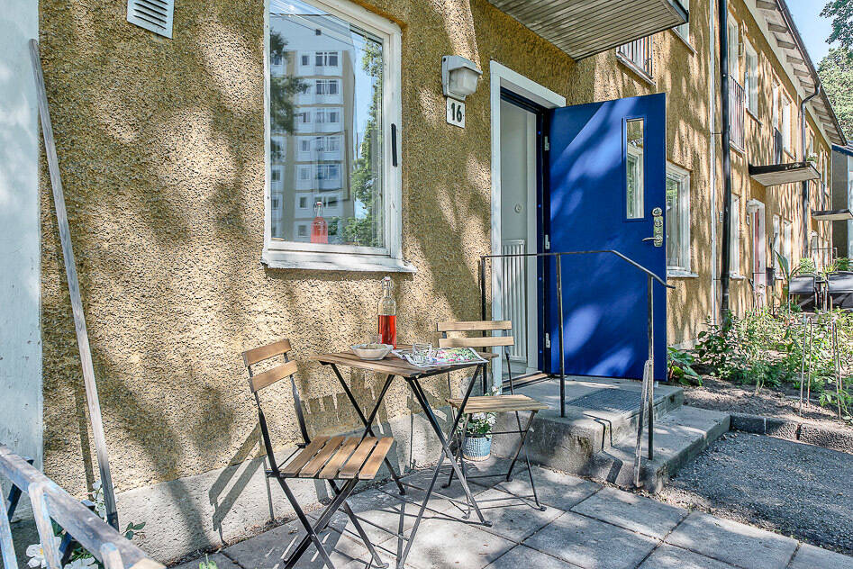 Uteplatserna tillhör föreningen men disponeras av bostadsrättsinnehavarna. Vill man göra förändringar på uteplatsen måste detta stämmas av med föreningen först. Däremot är man fri att plantera växter och blommor.